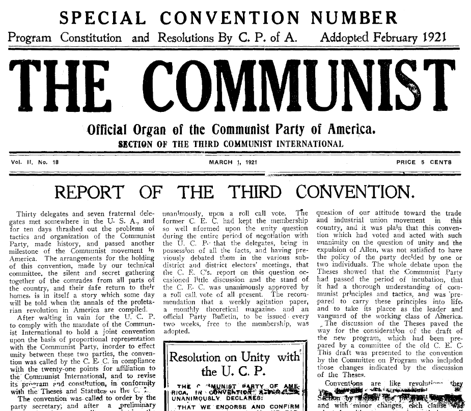 A report on the third, and last, congress of the (old) Communist Party of America held in February, 1921 before merging with the United Communist Party in May, 1921. The conference was mandated by the Communist International to approve the decisions of the Second Congress. Held in Brooklyn, and true to form of the (old) C.P., in secret. The 40 delegates also adopted a constitution, program, and discussed negotiations with the Ruthenberg-led U.C.P. As part of their fight with the U.C.P. they also print Trotsky’s letter to French syndicalists, linked to online text below.