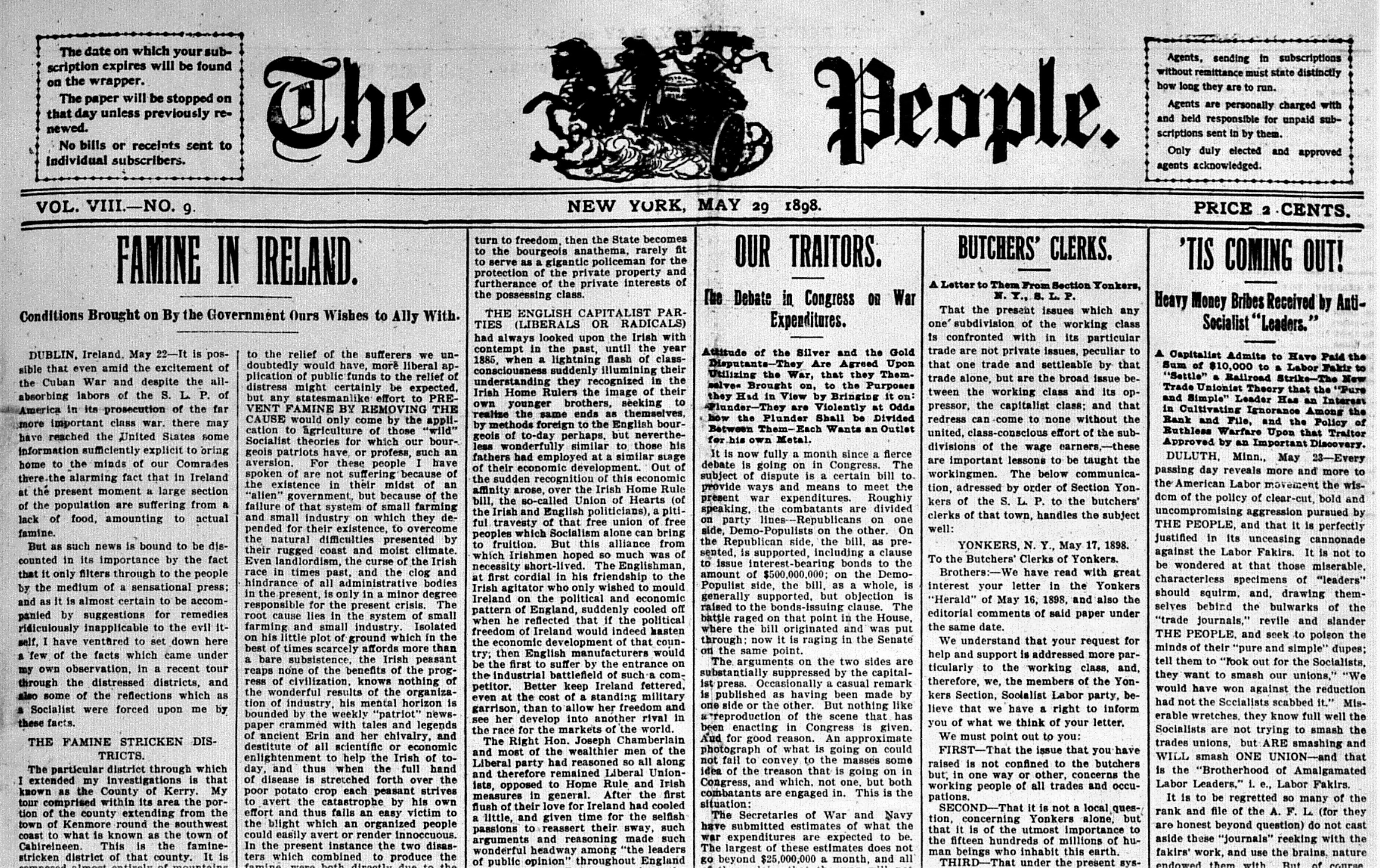 New York Labor News Company was the publishing house of the Socialist Labor Party and their paper The People. The People was the official paper of the Socialist Labor Party of America (SLP), established in New York City in 1891 as a weekly. The New York SLP, and The People, were dominated Daniel De Leon and his supporters, the dominant ideological leader of the SLP from the 1890s until the time of his death. The People became a daily in 1900. It’s first editor was the French socialist Lucien Sanial who was quickly replaced by De Leon who held the position until his death in 1914. Morris Hillquit and Henry Slobodin, future leaders of the Socialist Party of America were writers before their split from the SLP in 1899. For a while there were two SLPs and two Peoples, requiring a legal case to determine ownership. Eventual the anti-De Leonist produced what would become the New York Call and became the Social Democratic, later Socialist, Party. The De Leonist The People continued publishing until 2008.