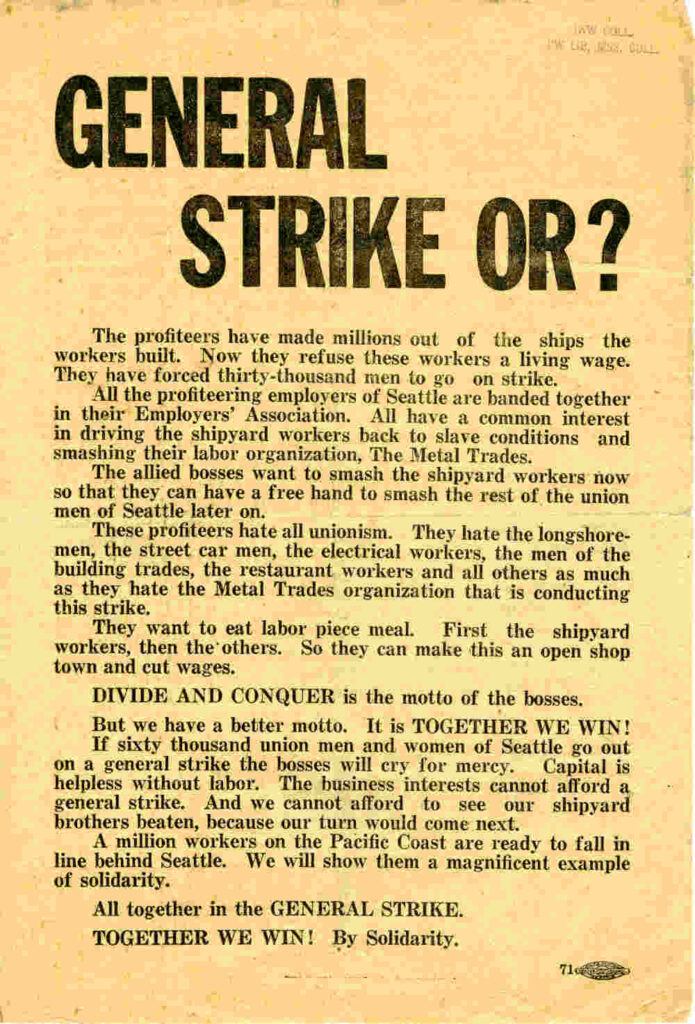 The shipyard workers of Seattle struck, 35,000 strong, on January 21st. On January 22, a request was brought to the Central Labor Council for a general strike in sympathy with the Metal Trades. This was referred to the various unions for referendum. By the following Wednesday, January 29, the returns were pouring in.