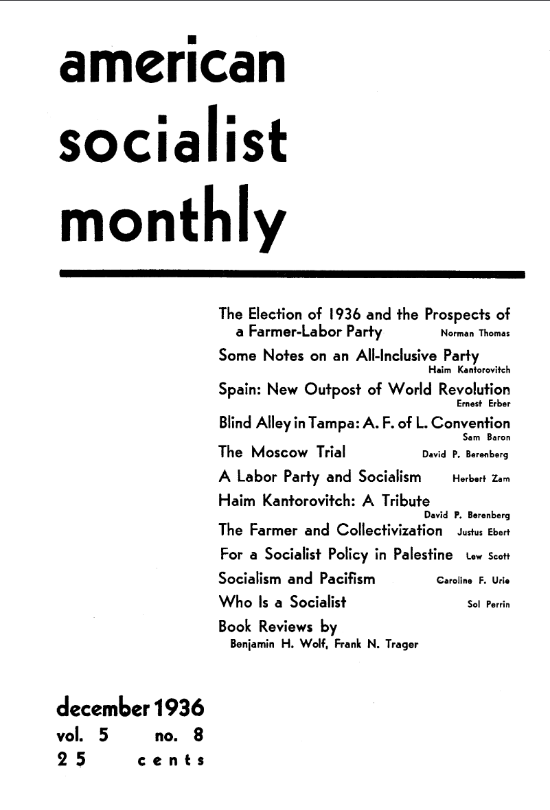 Contents: Notes of the Month, 1936 and the Prospect of a Farmer-Labor Party by Norman Thomas, Some Notes on an All-Inclusive Party by Haim Kanotrovich, Spain: New Outpost of World Revolution by Ernest Erber, Blind Alley in Tampa: AFL Convention by Sam Baron, The Moscow Trial by David P. Berenberg, A Labor Party and Socialism by Herbert Zam, Haim Kantorovich: A Tribute by David P. Berenberg, The Farmer and Collectivization by Justus Ebert, For a Socialist Policy in Palestine and Answer to Felix Morrow by Lew Scott, Socialism and Pacifism by Caroline F. Urie, Reply by James Burnham, What is a Socialist by Sol Perrin, Letters, Book Reviews.