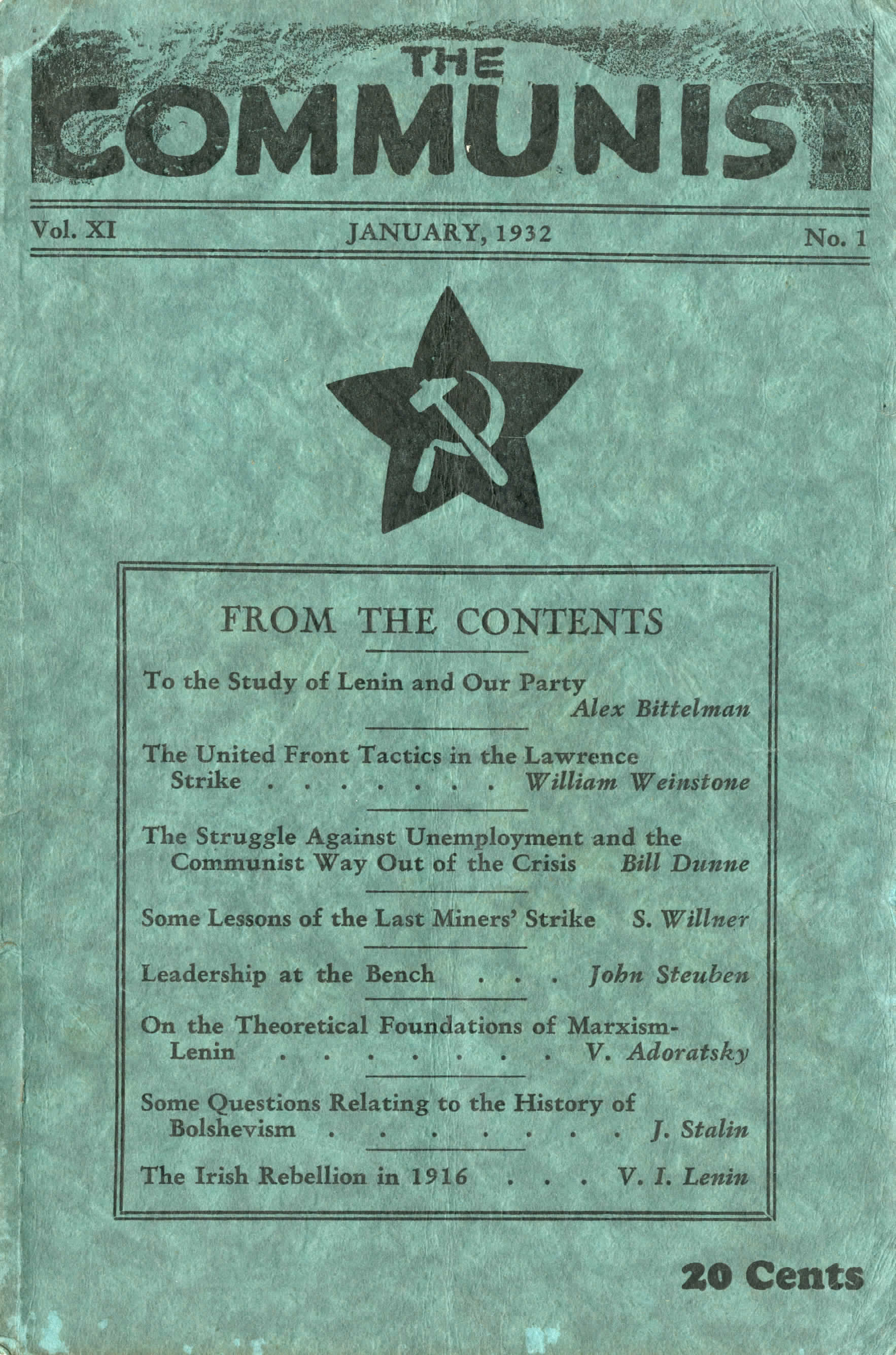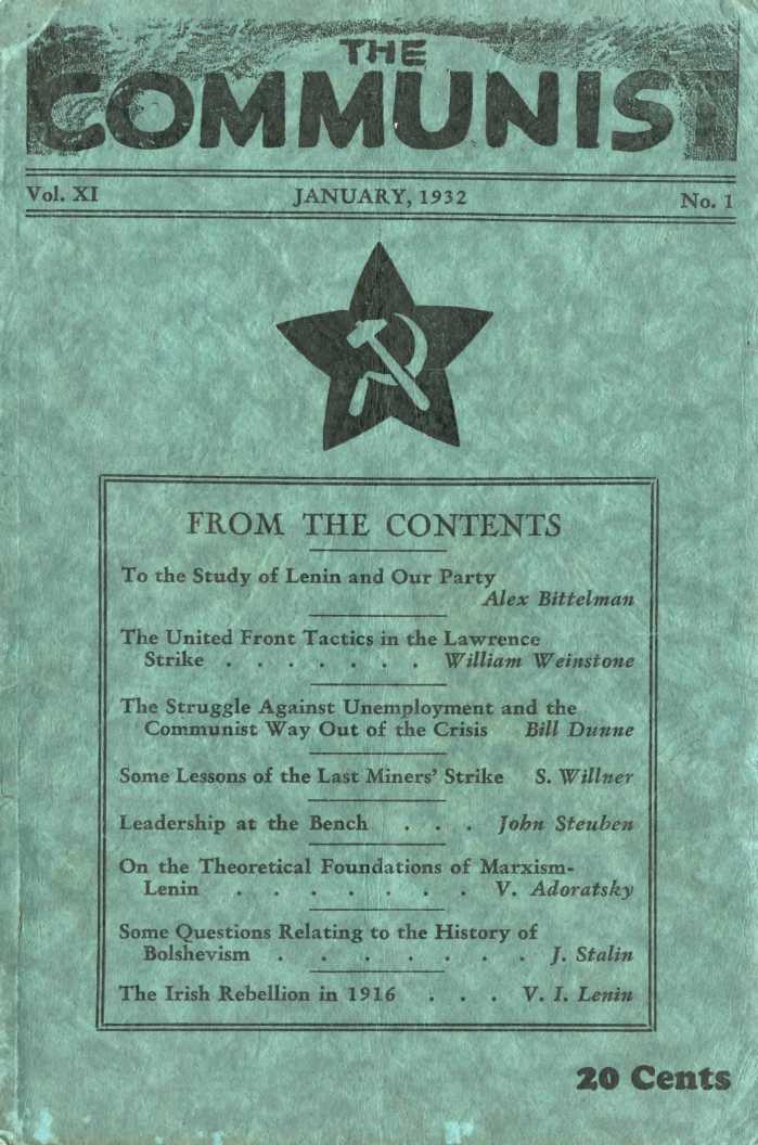 Contents: To The Study of Lenin and Our Party by Alex Bittelman, The United Front Tactics in the Lawrence Strike by William Weinstone, The Struggle Against Unemployment and the Communist Way Out of the Crisis by Bill Dunne, Some Lessons of the Last Miners’ Strike by S. Willner, Leadership At the Bench by John Steuben, On the Theoretical Foundations of Marxism-Leninism by V. Adoratsky, Some Questions Relating to the History of Bolshevism by J. Stalin, The Irish Rebellion in 1916 by V.I. Lenin, Hegel – Hundredth Anniversary of the Death of Hegel by K.A. Wittfogel, The Increased Danger of War Against the U.S.S.R. and the Tasks of the Communists – Resolution of the Eleventh Plenum of the E.C.C.I.