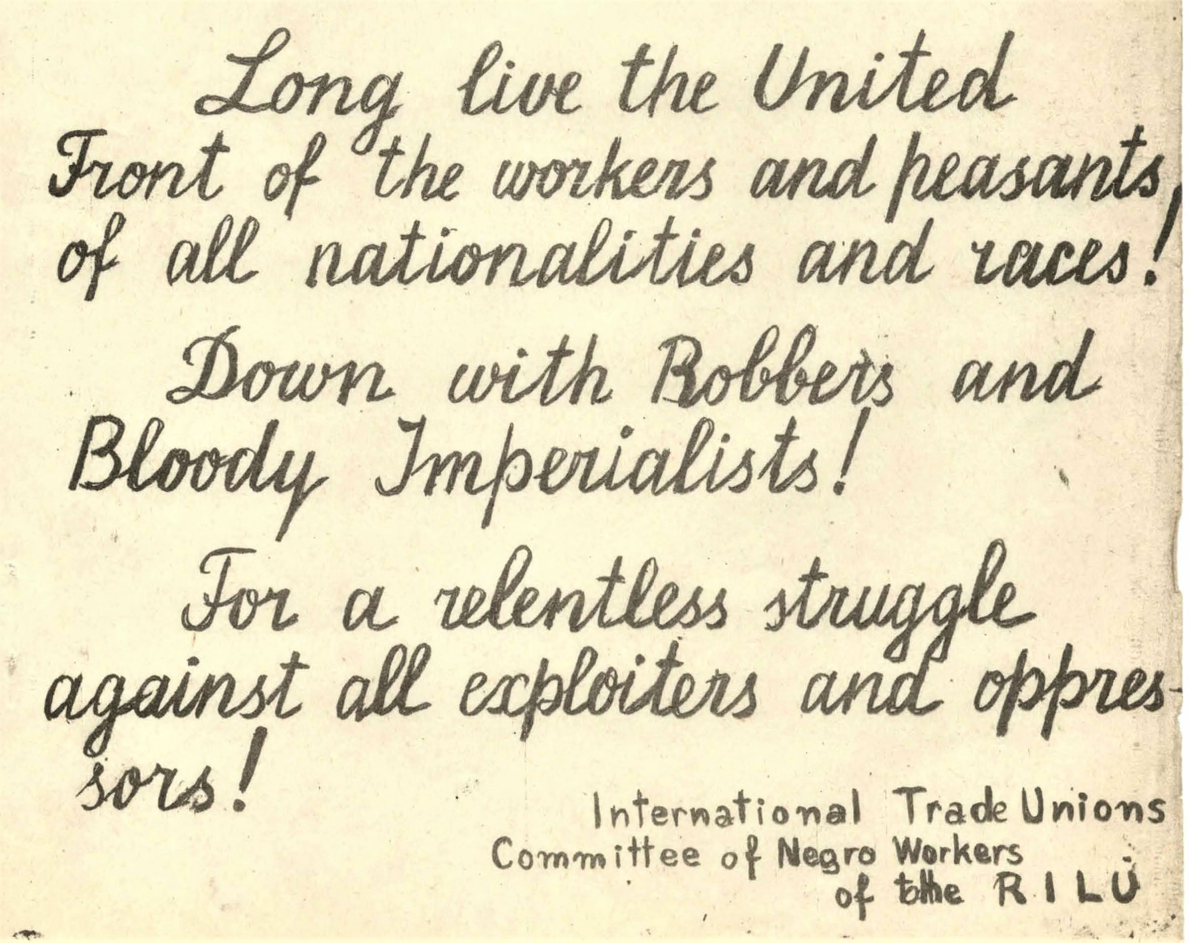 Issued by INTERNATIONAL TRADE UNION COMMITTEE OF Negro Workers of R.I.L.U.