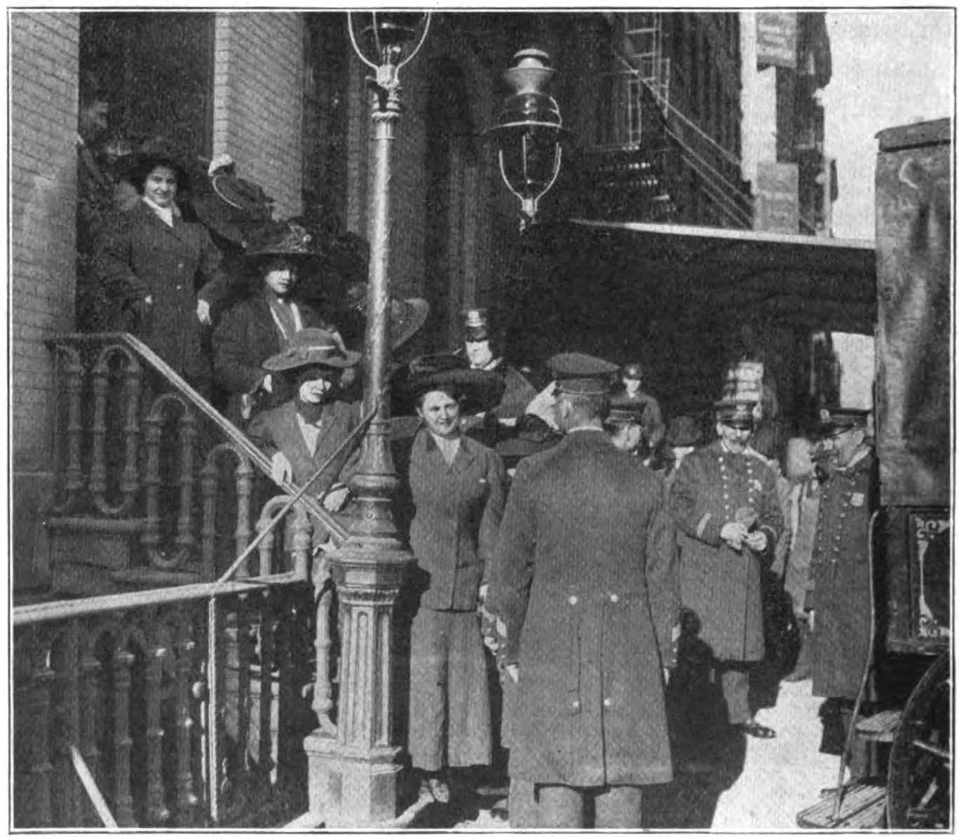 A strike is as sexless as a factory, and the laws for the Singers of the Shirt are the same as for the longshoreman and the miner. The employers have the police, thugs and plain-clothes men, the judges and the courts to help them. Against all these the girls pit themselves. Though peaceful picketing is permissible by law, about twenty-five or fifty girls are arrested daily. A boss can point out any one as a striker or charge her with calling “scab,” and she is immediately arrested, and roughly handled; then fined by the judge. In the beginning of the strike the fines were from two to three dollars. They are now from five to ten dollars, or three hundred dollars’ bail, to keep the peace for three months—which defined, means no picketing at all.