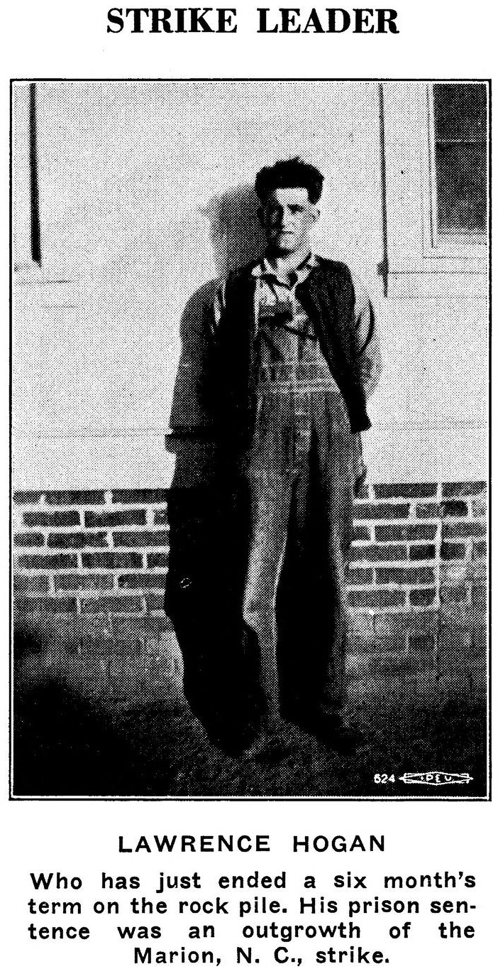Less than seven years ago Larry Hogan, a young married man of 24 who had come down out of the hills to work in a cotton mill, was not to be distinguished from tens of thousands of Southern textile workers. When, however, a $11.00 wage for a 70 hour week, plus a merciless speed-up, finally forced the workers of the Marion Mfg. Company to revolt, Larry was one of the leaders of the union and emerged from the long strike, in which six men were killed by drunken deputies on a picket line, as an outstanding figure.