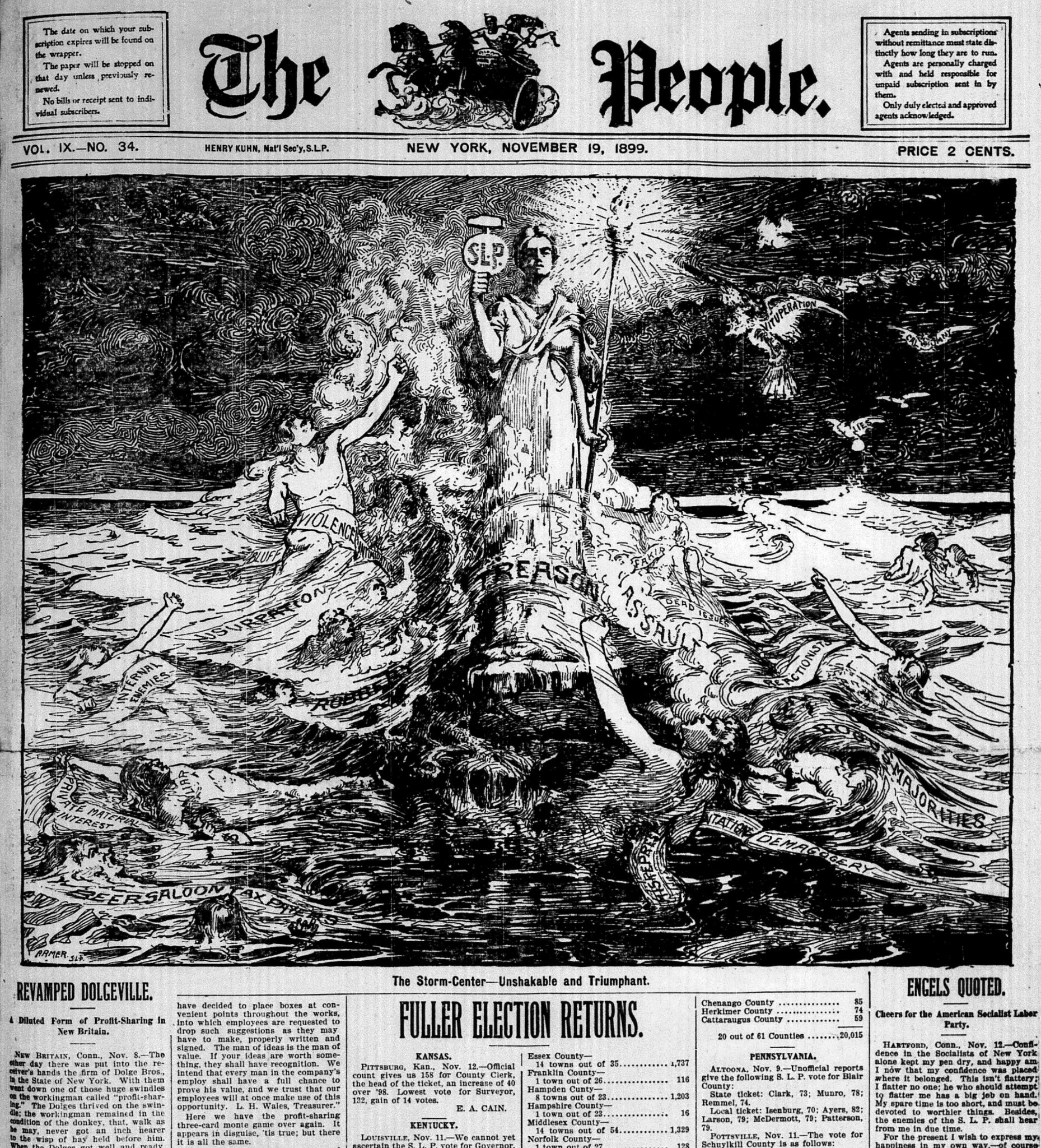 New York Labor News Company was the publishing house of the Socialist Labor Party and their paper The People. The People was the official paper of the Socialist Labor Party of America (SLP), established in New York City in 1891 as a weekly. The New York SLP, and The People, were dominated Daniel De Leon and his supporters, the dominant ideological leader of the SLP from the 1890s until the time of his death. The People became a daily in 1900. It’s first editor was the French socialist Lucien Sanial who was quickly replaced by De Leon who held the position until his death in 1914. Morris Hillquit and Henry Slobodin, future leaders of the Socialist Party of America were writers before their split from the SLP in 1899. For a while there were two SLPs and two Peoples, requiring a legal case to determine ownership. Eventual the anti-De Leonist produced what would become the New York Call and became the Social Democratic, later Socialist, Party. The De Leonist The People continued publishing until 2008.