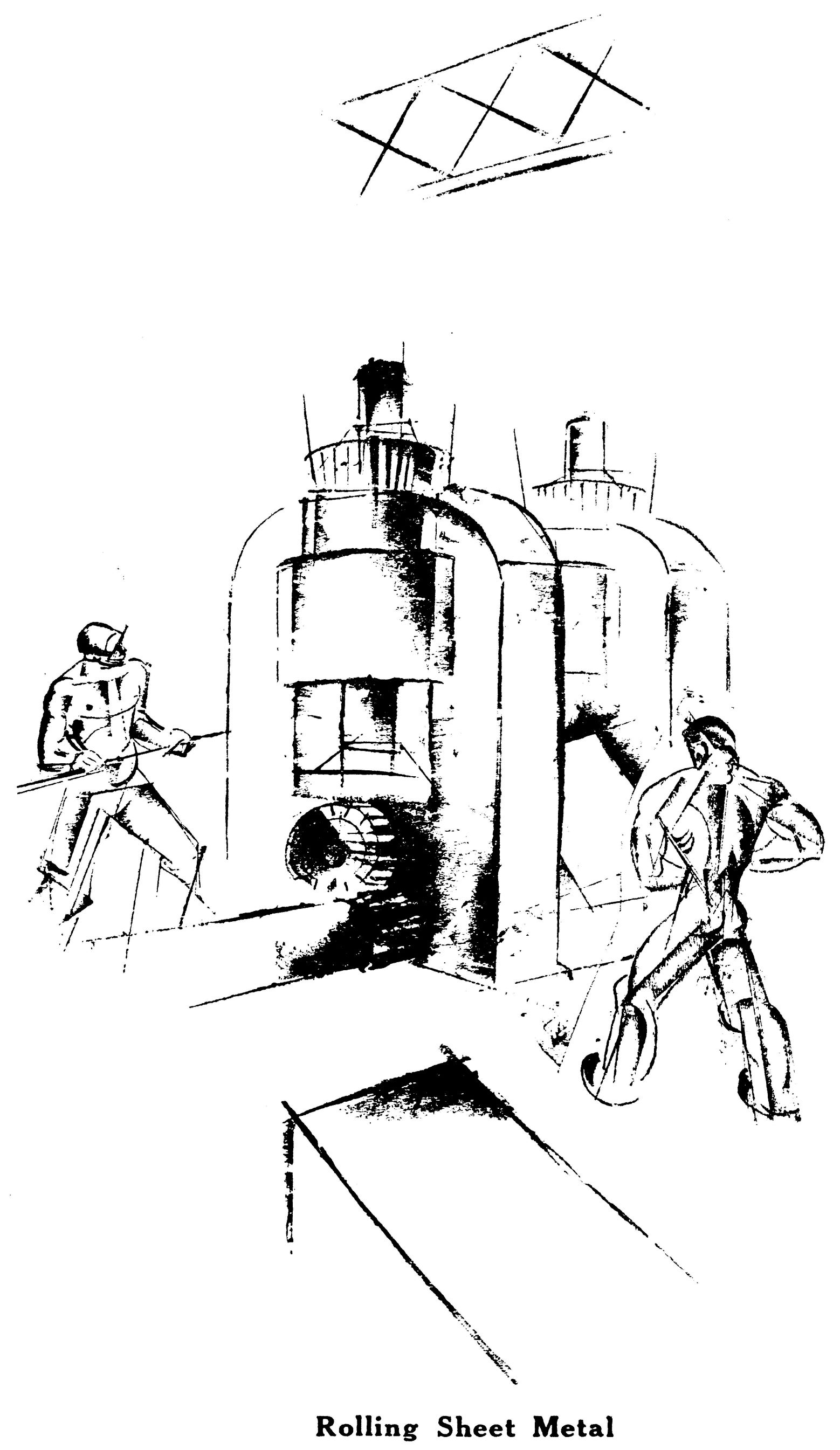 Flat bottomed barges float at the river bank. Great electric shovels suspended on cranes swoop down and bite into their cargo. Huge magnets lift a half dozen of the two-hundred-pound pigs of iron and dispose of them at will. Freight cars are hoisted into mid-air, turned over and emptied, then placed back on the rail. Steam hammers work busily up and down, shaping the iron like butter. Machines make wire and sheets of steel-and machines make machines…