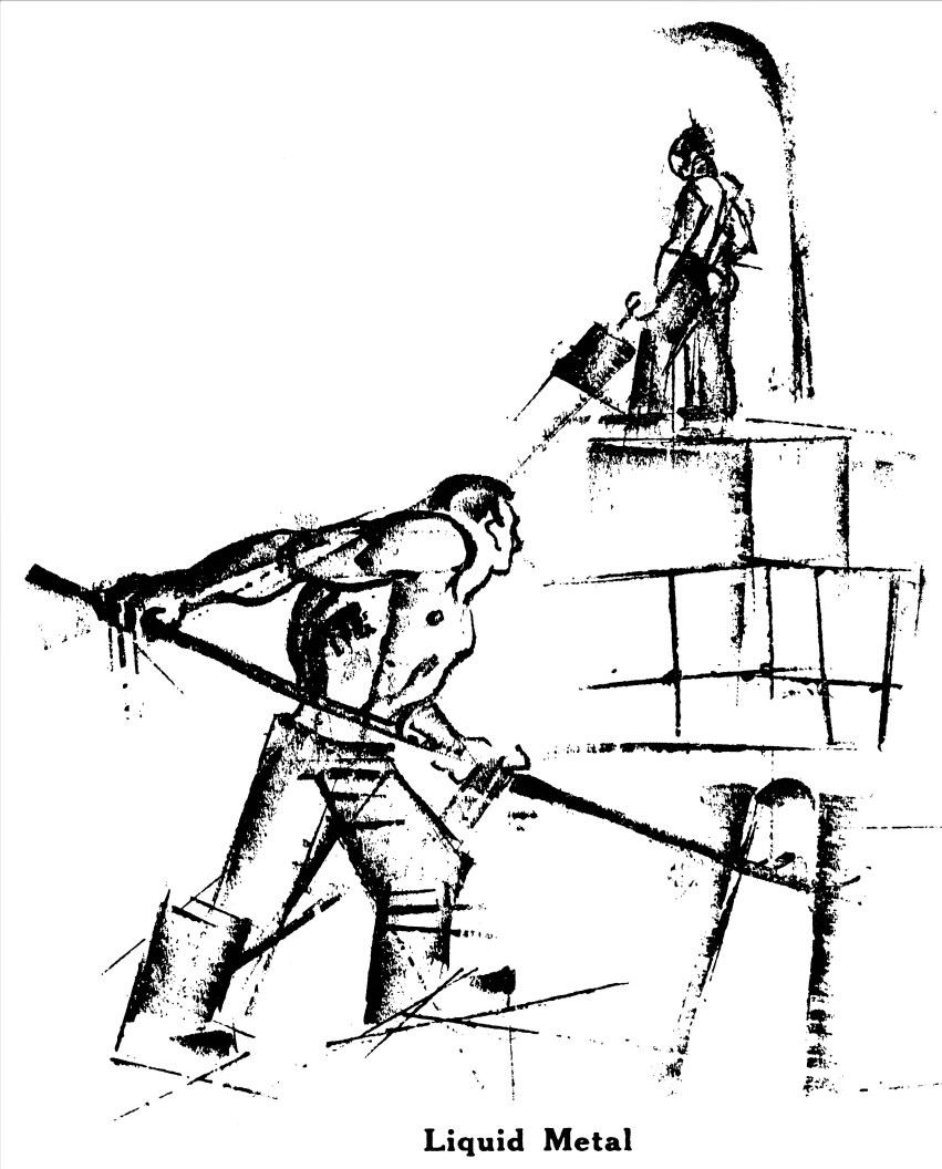A man knocks the mouth of the blast furnace open. A mighty roar, a blinding flash, and the molten ore breaks forth. It flows through ditches into the waiting ladle. Heavy sulphur fumes rise into the air. The men watch the course of the molten metal. They step across the narrow ditches and hustle to prevent their being clogged. A misstep, and a foot is off; it melts away like snowflakes on a window pane…When the ladle is full they top it with a shovel of coal. A thousand stars shoot into the air as the fine coal touches the golden liquid.