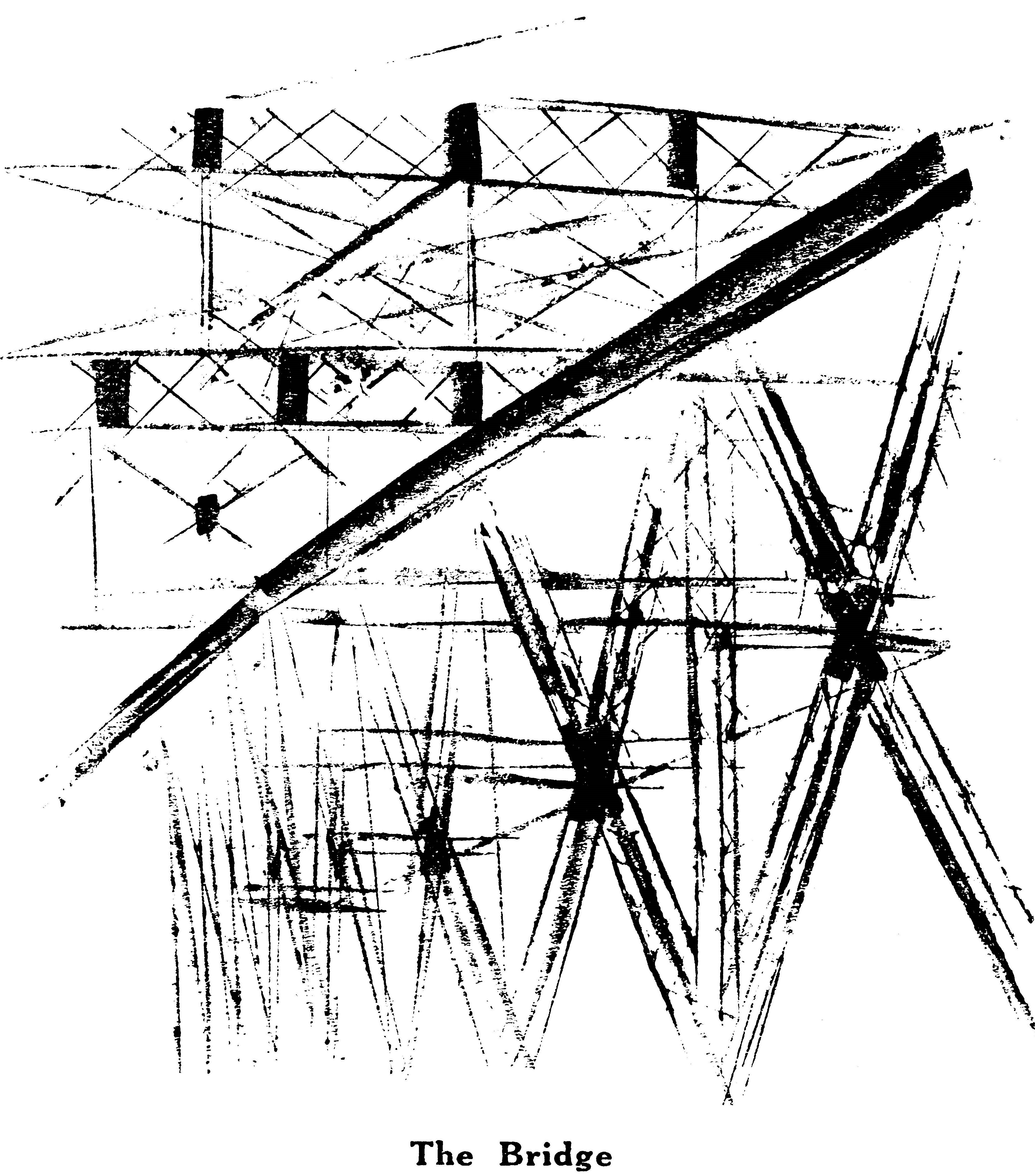 The bridge teaches me to appreciate lace-lace of steel. Heavy threads of steel interlocking and interchaining. Black steel lace against the light of the sky.