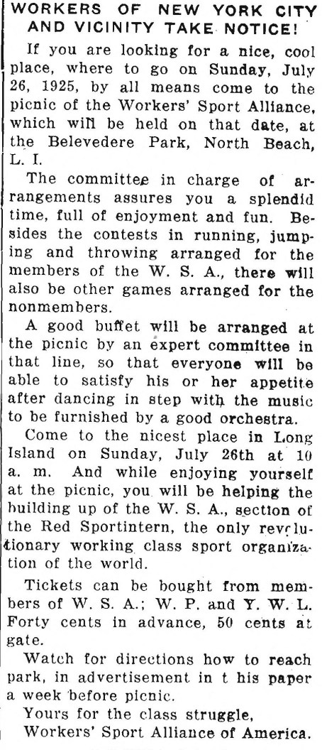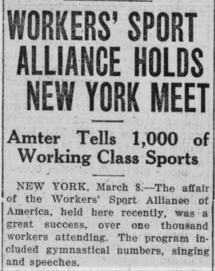 THEY MUST FIGHT FOR WORKING CLASS SPORT, FOR TRAINING MILITANT FIGHTERS OF THE WORKING CLASS; FOR THE FORMATION OF WORKING CLASS AND GYMNASTIC CLUBS FREE FROM CAPITALIST INFLUENCE; FOR THE AFFILIATION OP ALL WORKING CLASS SPORT CLUBS TO THE WORKERS’ SPORT ALLIANCE OF AMERICA; FOR AFFILIATION TO THE RED SPORT INTERNATIONAL; FOR PARTICIPATION IN THE RED OLYMPIAD IN MOSCOW IN 1926; FOR A STRONG WORKING CLASS, STRONG IN BODY AND MIND, AND FIGHTING FOR THE INTERESTS OF THE WORKING CLASS. SPREAD OF IDEAS OF THE WORKERS’ SPORT ALLIANCE IN YOUR UNIONS AND SHOPS. IT IS IN THE INTEREST OF THE ENTIRE WORKING CLASS.