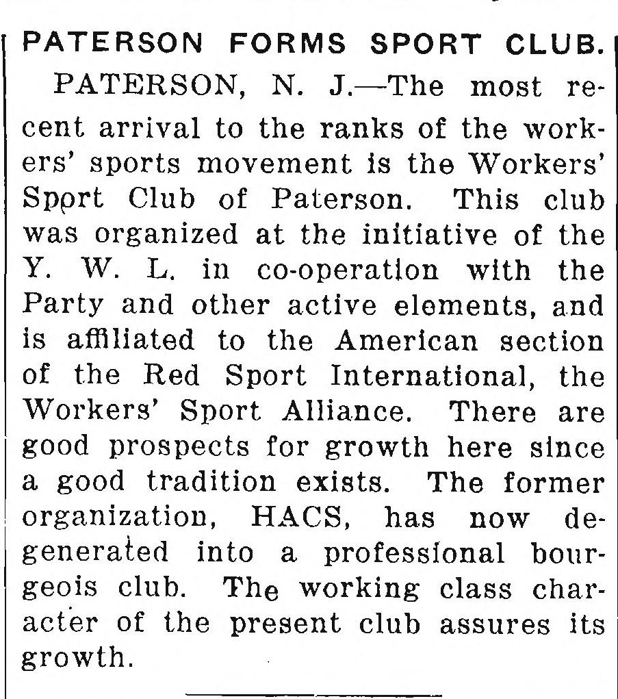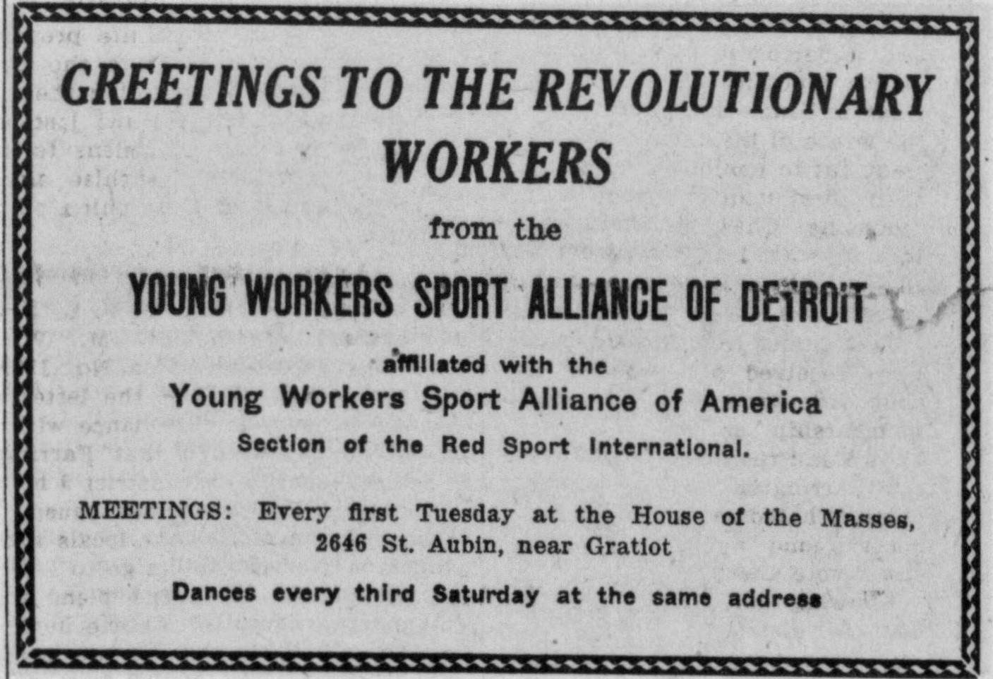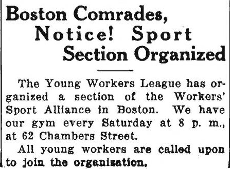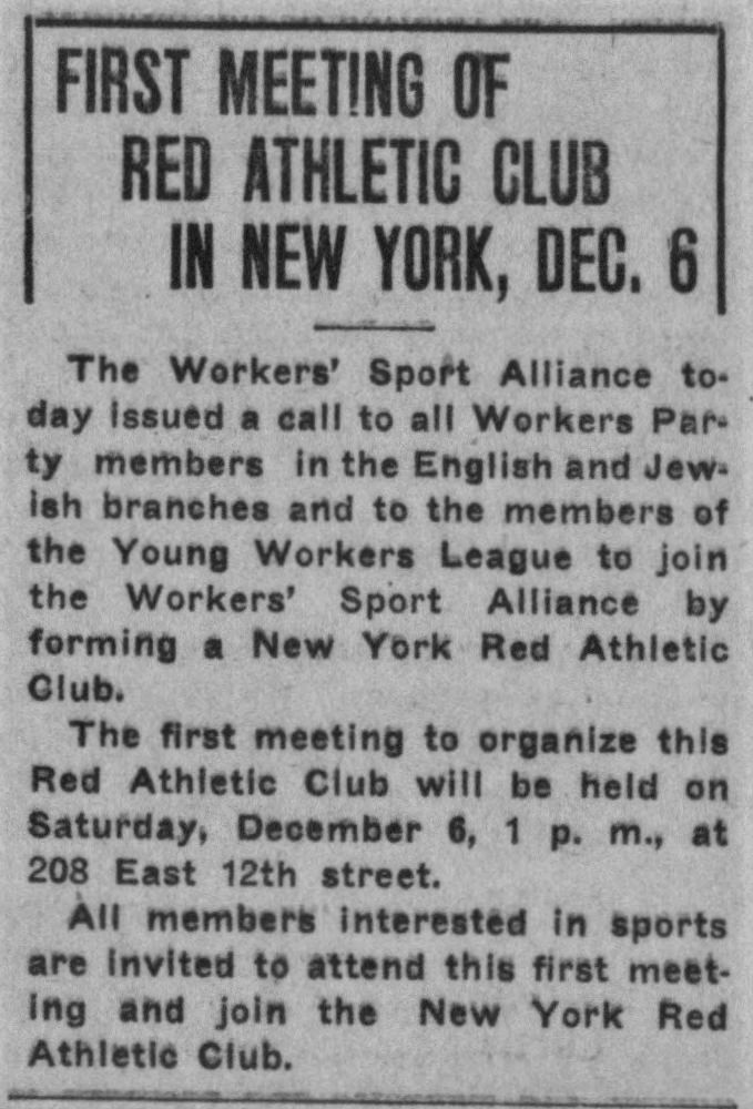 THEY MUST FIGHT FOR WORKING CLASS SPORT, FOR TRAINING MILITANT FIGHTERS OF THE WORKING CLASS; FOR THE FORMATION OF WORKING CLASS AND GYMNASTIC CLUBS FREE FROM CAPITALIST INFLUENCE; FOR THE AFFILIATION OP ALL WORKING CLASS SPORT CLUBS TO THE WORKERS’ SPORT ALLIANCE OF AMERICA; FOR AFFILIATION TO THE RED SPORT INTERNATIONAL; FOR PARTICIPATION IN THE RED OLYMPIAD IN MOSCOW IN 1926; FOR A STRONG WORKING CLASS, STRONG IN BODY AND MIND, AND FIGHTING FOR THE INTERESTS OF THE WORKING CLASS. SPREAD OF IDEAS OF THE WORKERS’ SPORT ALLIANCE IN YOUR UNIONS AND SHOPS. IT IS IN THE INTEREST OF THE ENTIRE WORKING CLASS.