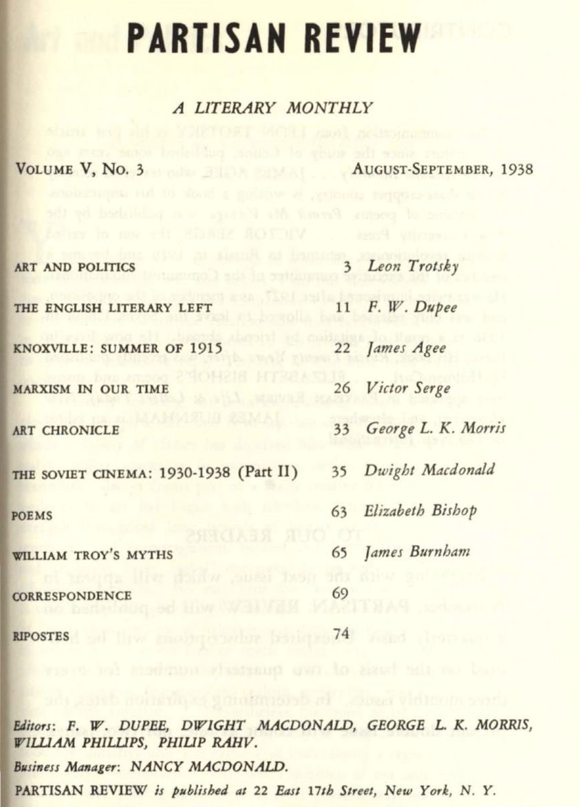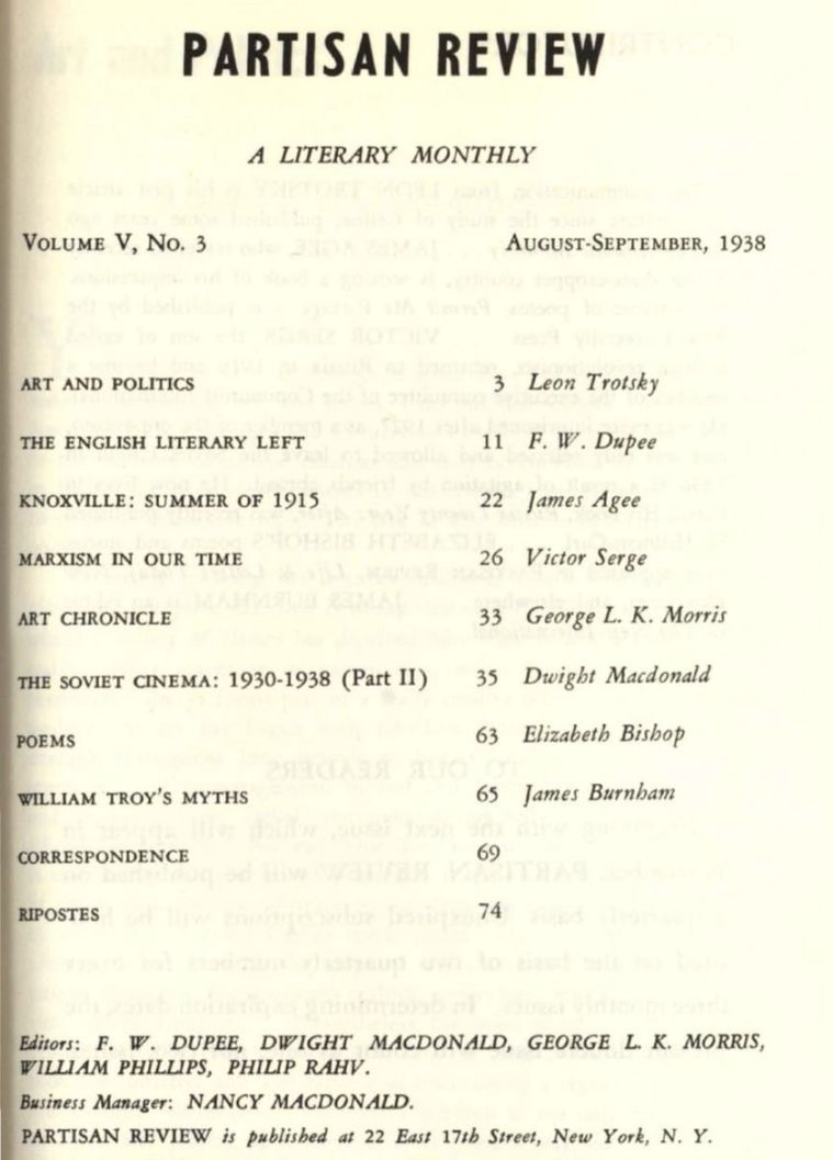 Contents: Notes on Contributors, Art and Politics by Leon Trotsky, The English Literary Left by F.W. Dupee, Knoxville: Summer of 1915 by James Agee, Marxism in Our Time by Victor Serge, Art Chronicle by George L.K. Morris, The Soviet Cinema 1930-1938 (Part II) by Dwight Macdonald, Poems by Elizabeth Bisbop, William Troy’s Myths by James Burnham, Correspondence, Ripostes.