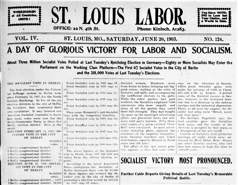A long-running socialist paper begun in 1901 as the Missouri Socialist published by the Labor Publishing Company, this was the paper of the Social Democratic Party of St. Louis and the region’s labor movement. The paper became St. Louis Labor, and the official record of the St. Louis Socialist Party, then simply Labor, running until 1925. The SP in St. Louis was particularly strong, with the socialist and working class radical tradition in the city dating to before the Civil War. The paper holds a wealth of information on the St Louis workers movement, particularly its German working class.