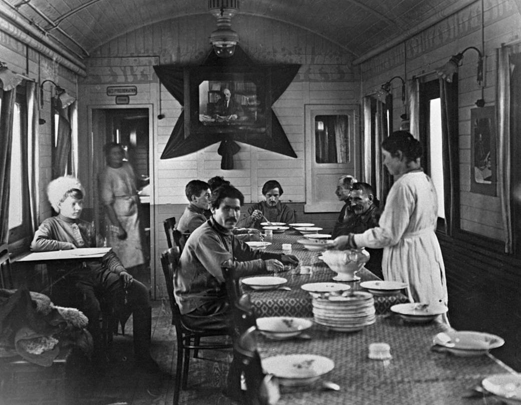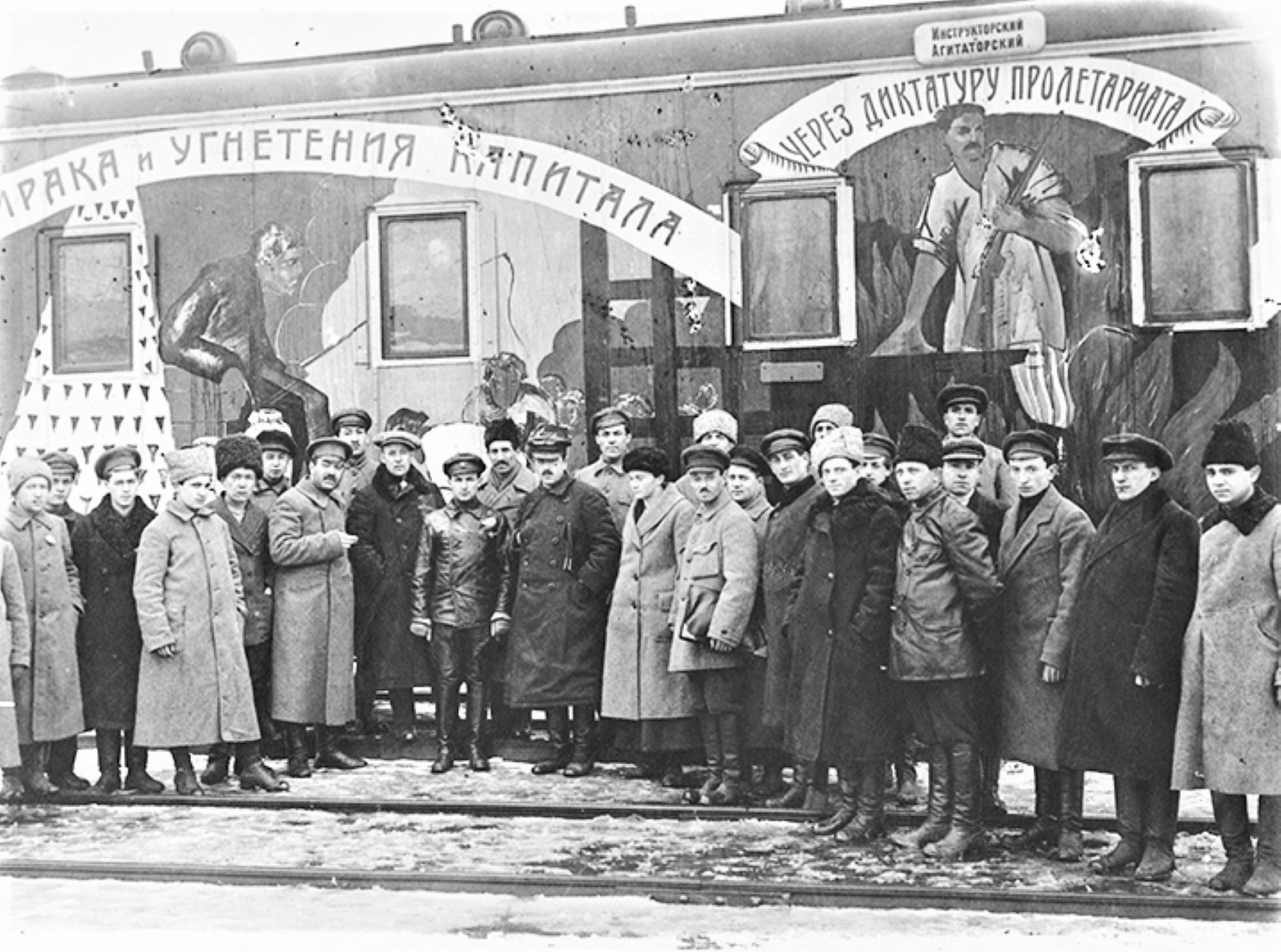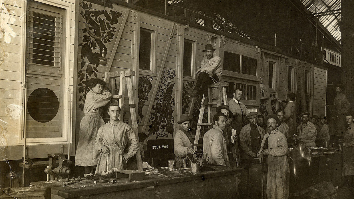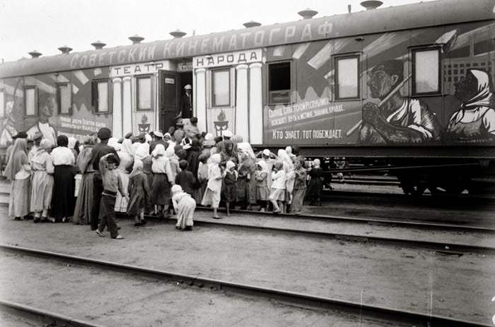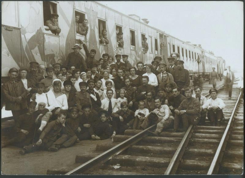 This train consists of 15 cars, decorated with paintings in bright colors, with forceful and unmistakably revolutionary inscriptions. It contains a moving picture apparatus and screen, a book shop, and a branch of the telegraph bureau, which posted the latest news at every station and sent out bulletins with the latest telegrams. On this train were representatives of almost all of the People’s Commissaries, and a staff of agitators.
