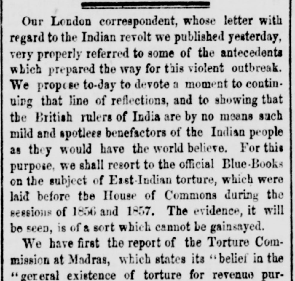 Our London correspondent, whose letter with regard to the Indian revolt we published yesterday, very properly referred to some of the antecedents which prepared the way for this violent outbreak. We propose to-day to devote a moment to continuing that line of reflections, and to showing that the British rulers of India are by no means such mild and spotless benefactors of the Indian people as they would have the world believe. For this purpose, we shall resort to the official Blue Books… on the subject of East-Indian torture, which were laid before the House of Commons during the sessions of 1856 and 1857. The evidence, it will be seen, is of a sort which cannot be gainsayed.