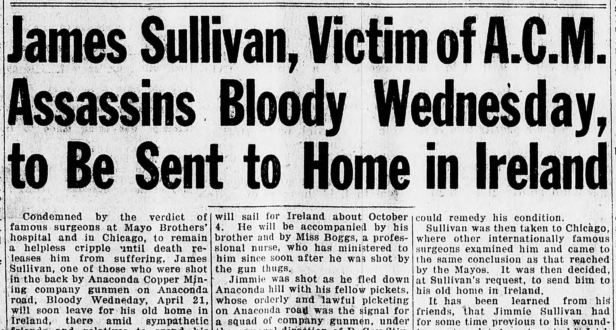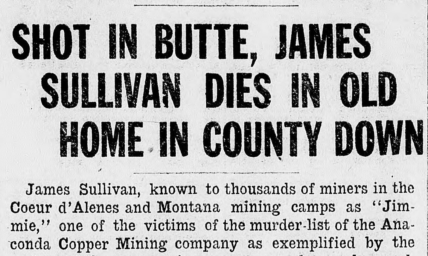 James Sullivan, known to thousands of miners in the Coeur d’Alenes and Montana mining camps as “Jimmie,” one of the victims of the murder-list of the Anaconda Copper Mining company as exemplified by the actions of the company’s gunmen on Anaconda road, Butte, Bloody Wednesday, April 21, 1920, is dead. Jimmie died yesterday at the home of his parents, Donaghadee, County Down, Ireland, where he had been taken last September, a helpless cripple, to spend the remaining days of his life with his parents and sisters and brothers.