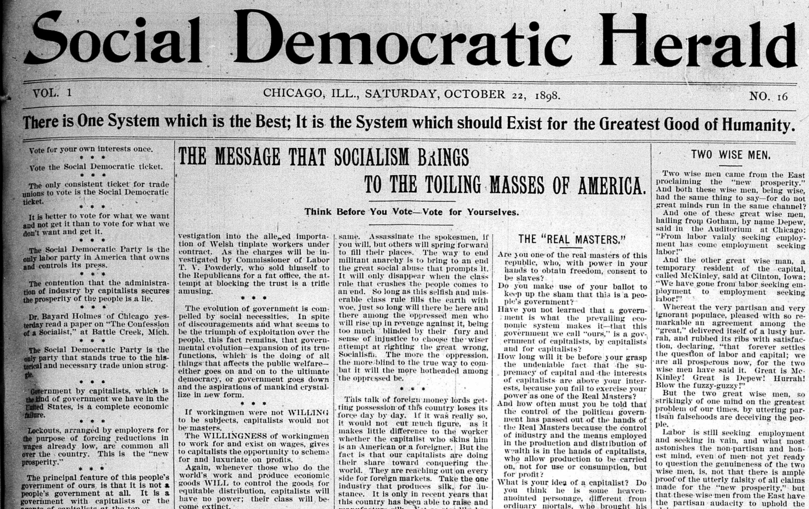 The Social Democratic Herald began as the Social Democrat. The Social Democrat was the paper of Eugene Debs’ pioneering industrial union, the American Railway Union. Begun in 1894 as the Railway Times, in July of 1897 it was renamed The Social Democrat and served as the paper of the Chicago based Social Democratic Party. First published in Terre Haute and then Chicago, the paper was produced weekly. After a split with Utopians who retained the paper, Debs’ published The Social Democratic Herald. When they joined with the Springfield, Massachusetts based Social Democratic Party in 1901, the Socialist Party was born. Victor Berger took over the paper in 1901 and moved it Milwaukee where it ran until 1913.