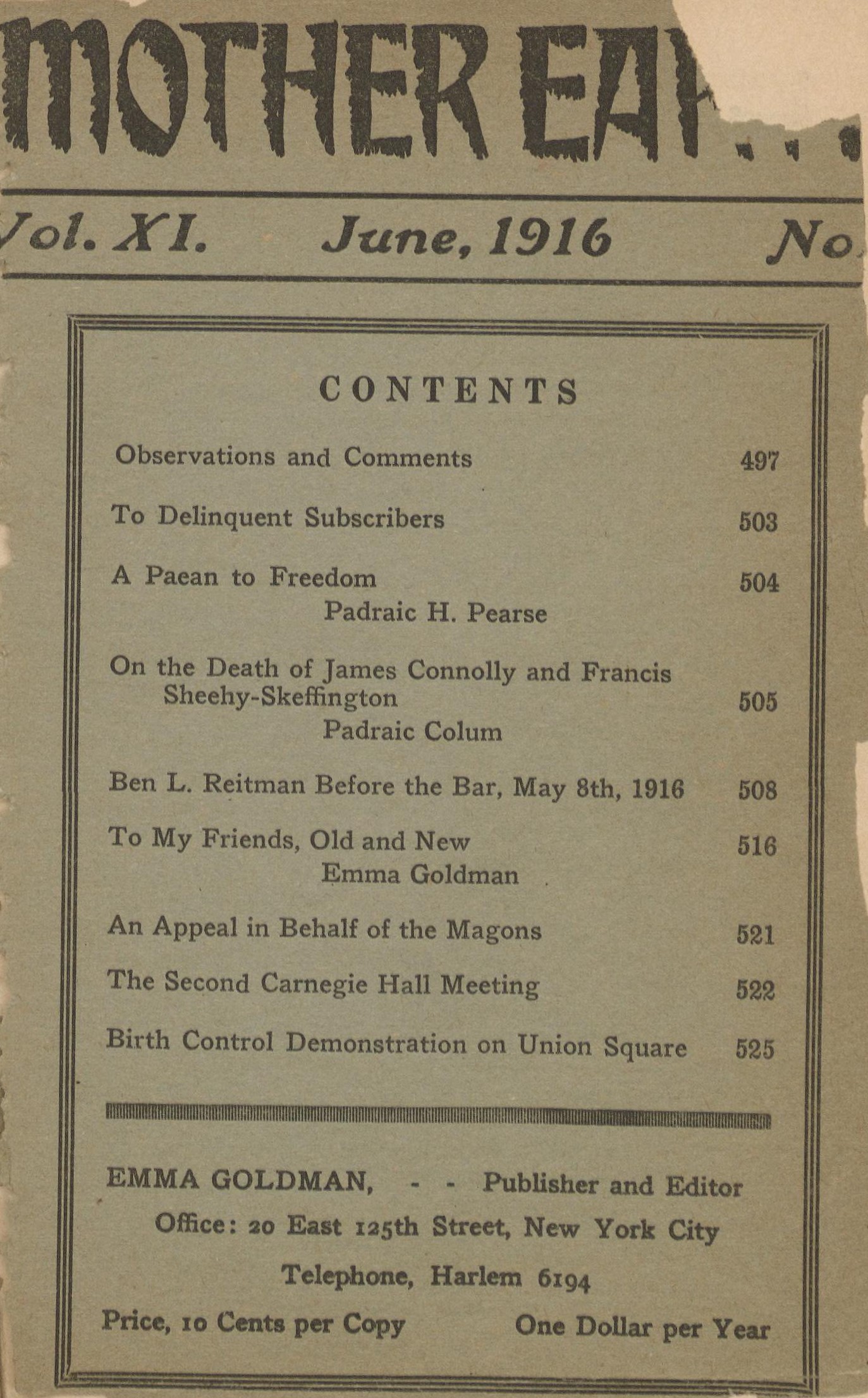 Contents: Observations and Comments, To Delinquent Subscribers 3 503 : A Paean to Freedom by Padraic H. Pearse, On the Death of James Connolly and Francis Sheehy-Skeffington by Padraic Colum, Ben L. Reitman Before the Bar, May 8th, 1916 , To My Friends, Old and New by Emma Goldman, An Appeal in Behalf of the Magons, The Second Carnegie Hall Meeting, Birth Control Demonstration on Union Square.