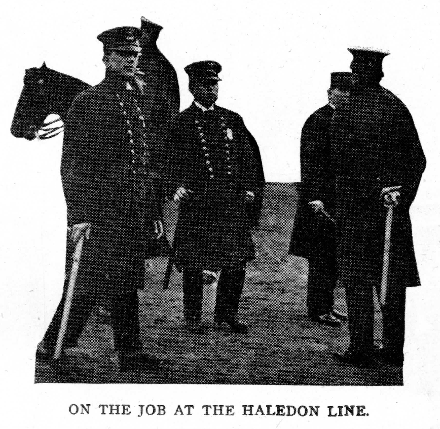 In the meantime, a squad of special police detailed for special duty, namely, to prevent the meeting and disperse the crowd, held up Haywood and Lessig a block before they reached the Oval. The police informed Haywood that no meeting would be allowed, and that if he attempted to speak he would be arrested, whereupon the strikers within hearing distance shouted: “On to Haledon!”