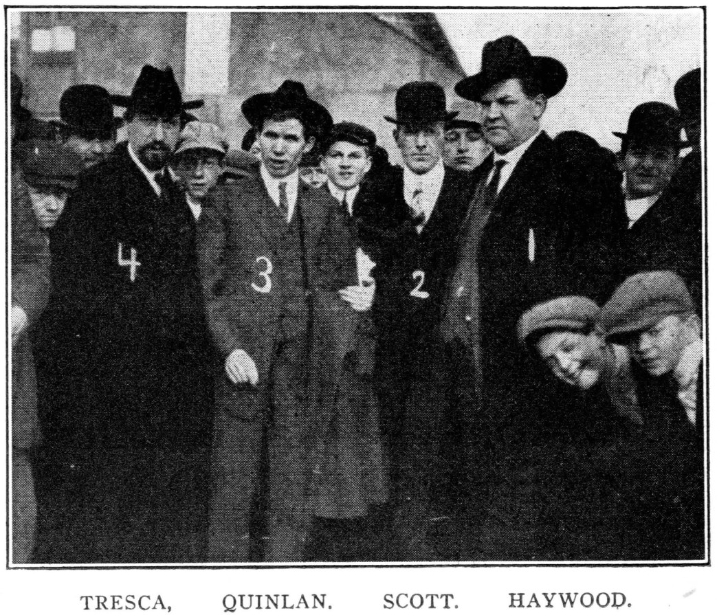 The crowd was perfectly orderly, although without any formation, but when it had got within half a block of the city’s limits the patrol wagon thundered through the mass of men, women and children to where Haywood and Lessig were walking in front. Motorcycle police had noted the general direction of the crowd and had rushed for the wagon, which was hooted and jeered by the strikers as it dashed directly for Haywood and Lessig. Police Sergeant Ryan jumped out of the wagon, pointed at Haywood, saying, “You’re under arrest!” and grabbed Lessig, at the same time shouting, “Get Tresca!”