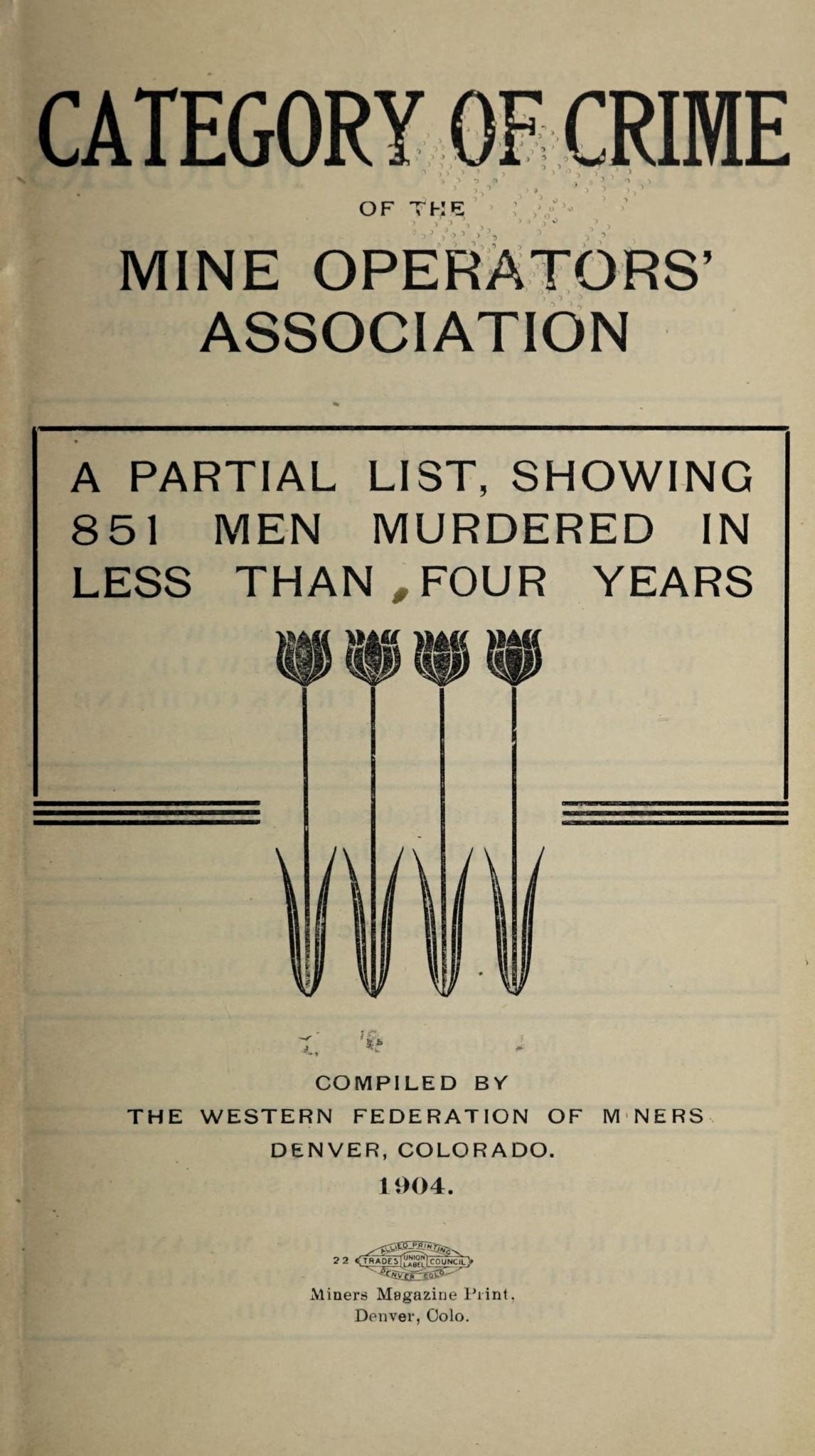 Category of Crime of the Mine Operators’ Association by the Western Federation of Miners, Denver. 1904.