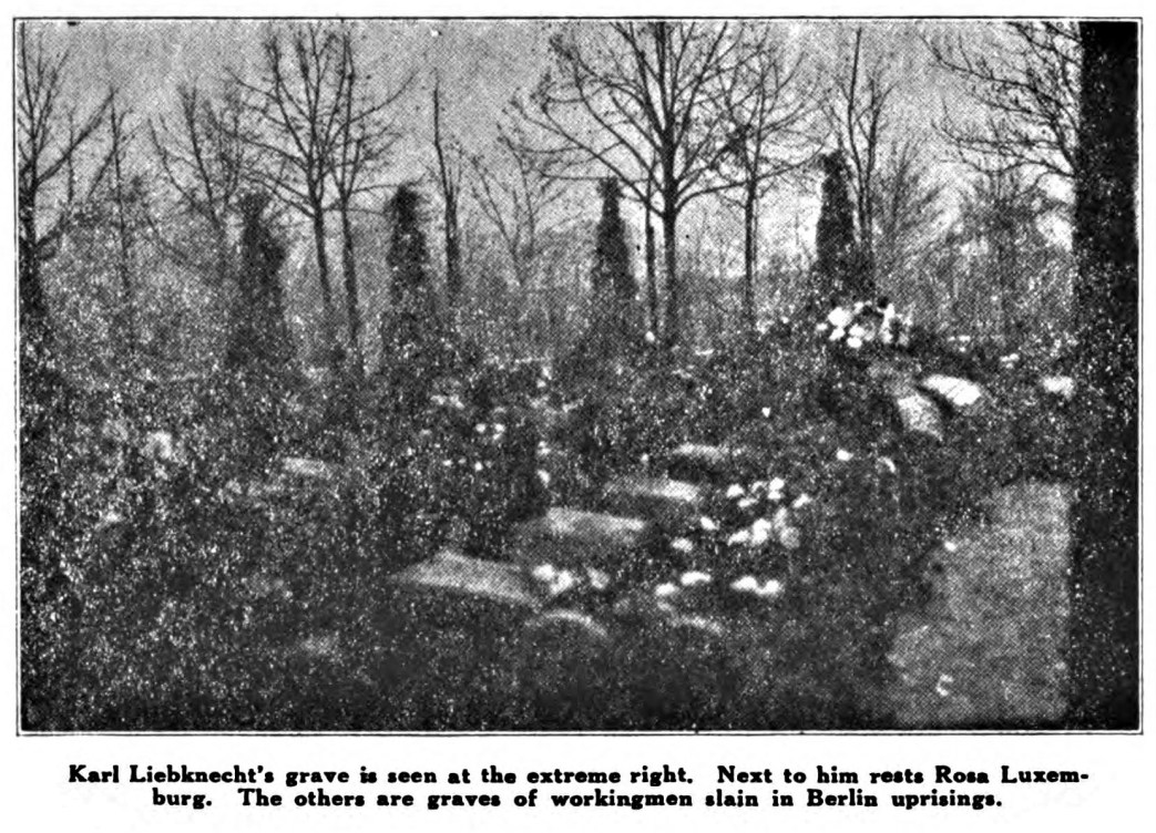 By the side of Liebknecht and Luxemburg rest many of the bravest hearts that ever beat in Germany. Is it not strange that out of all the German millions who died in the war against the Allies, these few martyrs who gave their lives for the good cause of liberating the working class from wage slavery receive more tender thought and solicitude than all those who died in the capitalist war? They still live, and one cannot visit the graves without recalling the words of another heroic German, legally murdered in Chicago in 1887: “There will come a time when our silence will speak louder than the voices you strangle today.”