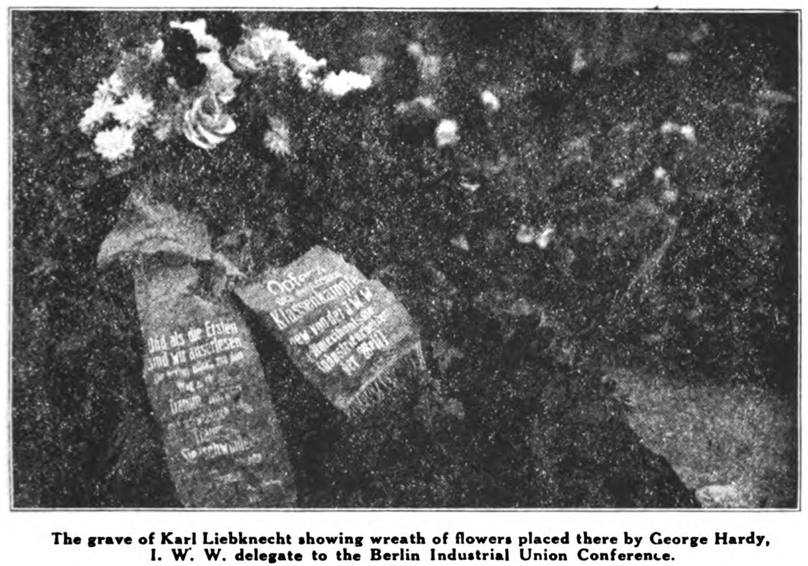 On Christmas Day we again visited the cemetery, and Fellow Worker Hardy placed a wreath bearing the inscription of the Industrial Workers of the World upon the grave of Karl Liebknecht. That wreath is a token of the community of purpose that exists between the revolutionary industrial workers of America, Germany, and all other countries. It is an earnest of a fraternity and solidarity that not all the hell-born ingenuity of capitalism can dissipate or sidetrack. It is an indication of a real understanding for the future, that will make our class invincible.