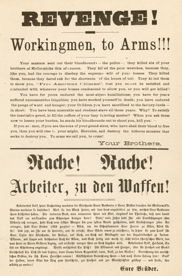 On the afternoon of May 3rd, there were large numbers of strikers in the Southwestern portion of Chicago, among them the McCormick Reaper Works’ employees. According to the capitalist papers there was rioting among them. The police were called out to quell the riots. As is usually the case, when the police were called out, the working people were sticking together in large numbers; police did manage to quell some of them. On this occasion, they shot seven working men and clubbed many hundreds unmercifully.
