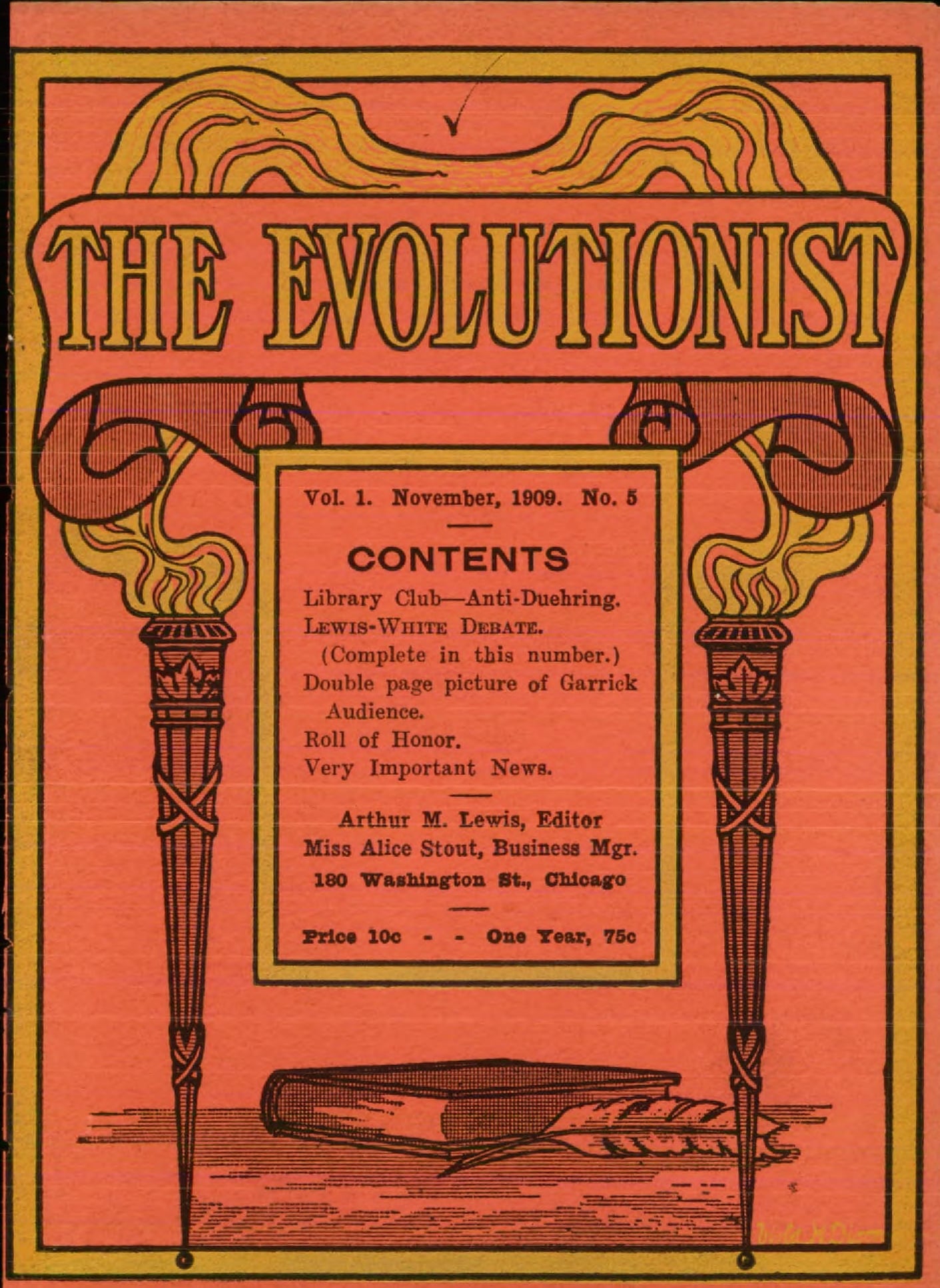 The Evolutionist was a vehicle for Marxist lecturer on natural and social sciences Arthur M. Lewis. It ran for only nine issues between 1909-10 and hosted Lewis’ debates from his ‘Workers’ University’ as well as book reviews, articles on science, and news from the Garrick Theater and Workers University. Self-taught iron molder Arthur Morrow Lewis became one of the foremost popularizers of evolution, socialism, and science during his too short life. One of his most popular works, ‘Evolution Social and Organic’ went through ten editions in six years. Morrow led the Workers University in Chicago and regularly taught classes, mostly on natural science and its relationship to materialism, at the Garrick Theater. Morrow is emblematic of the ‘positivist’ scientific and socialist thinking of the time. His partner was the first woman elected to the Socialist Party’s National Executive, Lena Morrow Lewis.