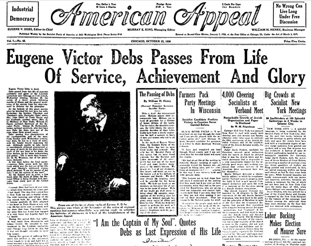 American Appeal was a newspaper nominally edited by Eugene V. Debs that served as a semi-official organ of the Socialist Party of America in the 1920s. Published weekly out of Chicago, American Appeal took over for the The Socialist World in 1925, also published by the SPA and ‘edited’ by Debs with Murray King as Managing Editor.