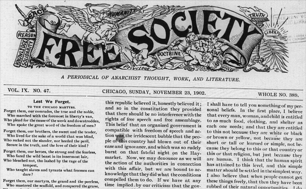 “An Exponent of Anarchist-communism: Holding That Equality of Opportunity Alone Constitutes Liberty. That in the Absence of Monopoly, Price and Competition Cannot Exist. And That Communism is an Inevitable Consequence.” Free Society was the most important English-language anarchist newspaper of its time. It continued ‘The Firebrand,’ which was founded in 1895 and edited by Abe and Mary Isaak in Portland, Oregon. The Isaak family moved to San Francisco after an obscenity arrest and restarted as ‘Free Society.’ The paper folded in New York City in November, 1904. Emma Goldman, a contributor to the Firebrand and Free Society, would start ‘Mother Earth’ in 1906 and continue the tradition of Free Society and The Firebrand.
