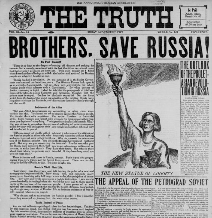 Truth emerged from the The Duluth Labor Leader, a weekly English language publication of the Scandinavian local of the Socialist Party in Duluth, Minnesota and began on May Day, 1917 as a Left Wing alternative to the Duluth Labor World. The paper was aligned to both the SP and the I.W.W. leading to the paper being closed down in the first big anti-I.W.W. raids in September, 1917. The paper was reborn as Truth, with the Duluth Scandinavian Socialists joining the Communist Labor Party of America in 1919. Shortly after the editor, Jack Carney, was arrested and convicted of espionage in 1920. Truth continued to publish with a new editor J.O. Bentall until 1923 as an unofficial paper of the C.P.