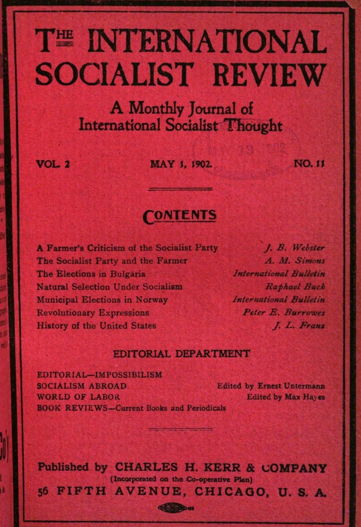 Contents A Farmer’s Criticism of the Socialist Party by J.B. Webster, The Socialist Party and the Farmer by A.M. Simons,The Elections in Bulgaria from The International Socialist Bureau Bulletin, Natural Selection Under Socialism by Raphael Buck, Municipal Elections in Norway from The International Socialist Bureau Bulletin, Revolutionary Expressions by Peter E. Burrows, History of the United States by J.L. Franz, Editorial: Impossibilism Socialism Abroad by Ernest Untermann, World of Labor by Max Hayes, Book Reviews, Current Books and Periodicals.