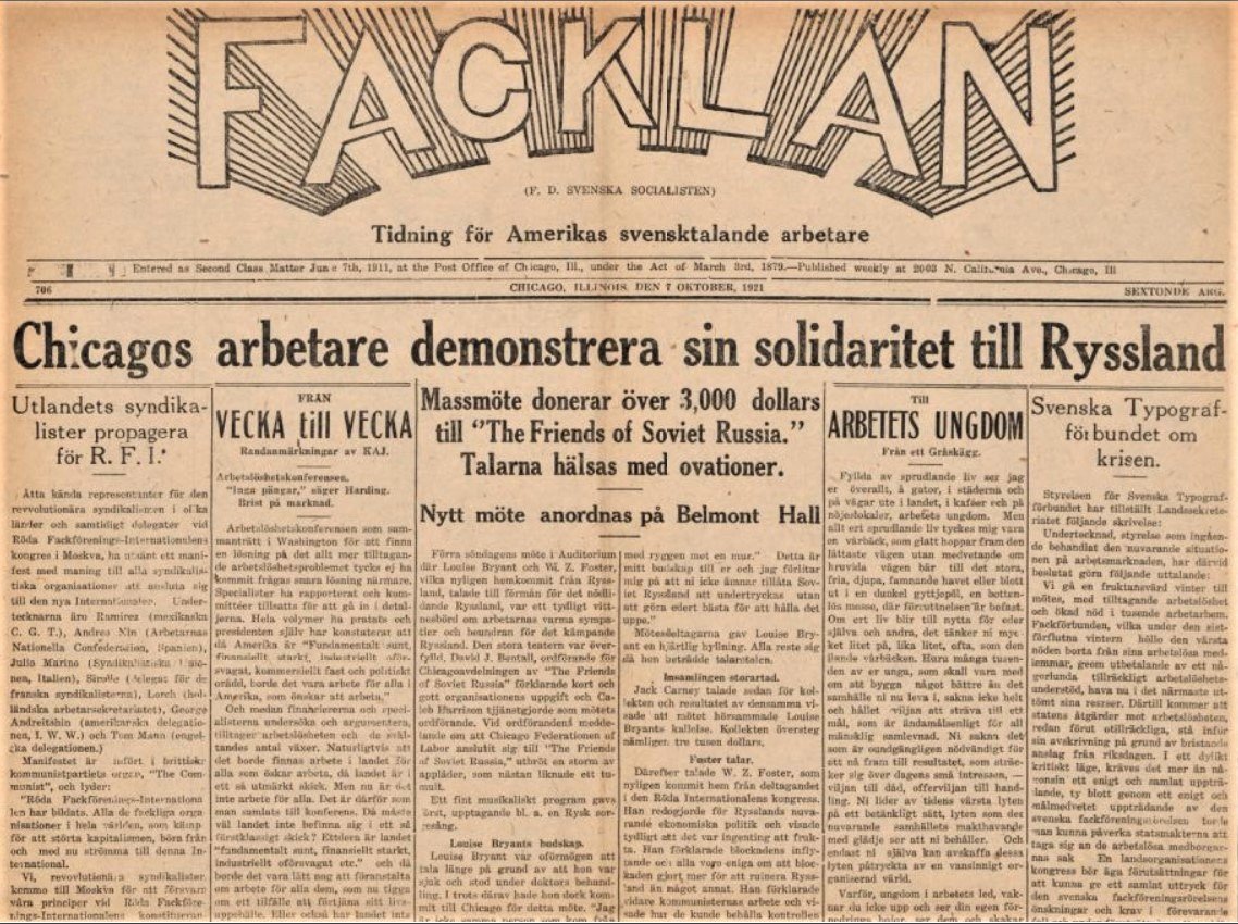 Facklan (The Torch) emerged from Svenska Socialisten (The Swedish Socialist). Svenska Socialisten was founded in 1905 in Rockport, Illinois as the paper of local Swedish Socialist Clubs. In 1911, the paper moved to Chicago and became the national organ of the Socialist Party’s Scandinavian Socialist Federation. Edited for much of those years by Henry Bengston at 911 Belmont Avenue, Chicago. Faction fights and Palmer raids ended Svenska Socialisten by 1920, but was reborn as the pro-Communist Facklan (The Torch) in 1921 after the majority of the Left Wing SSF were expelled from the SP. After the SSF merged with the Workers (Communist) Party the paper was renamed Ny Tid (New Era) in 1922 with offices at 3204 North Clark Street as the organ of the CP’s Scandinavian Federations moving to New York City in 1931. There, along with Swedish, the paper published sections in Norwegian, Danish, and English. Ny Tid ended its run in 1936.