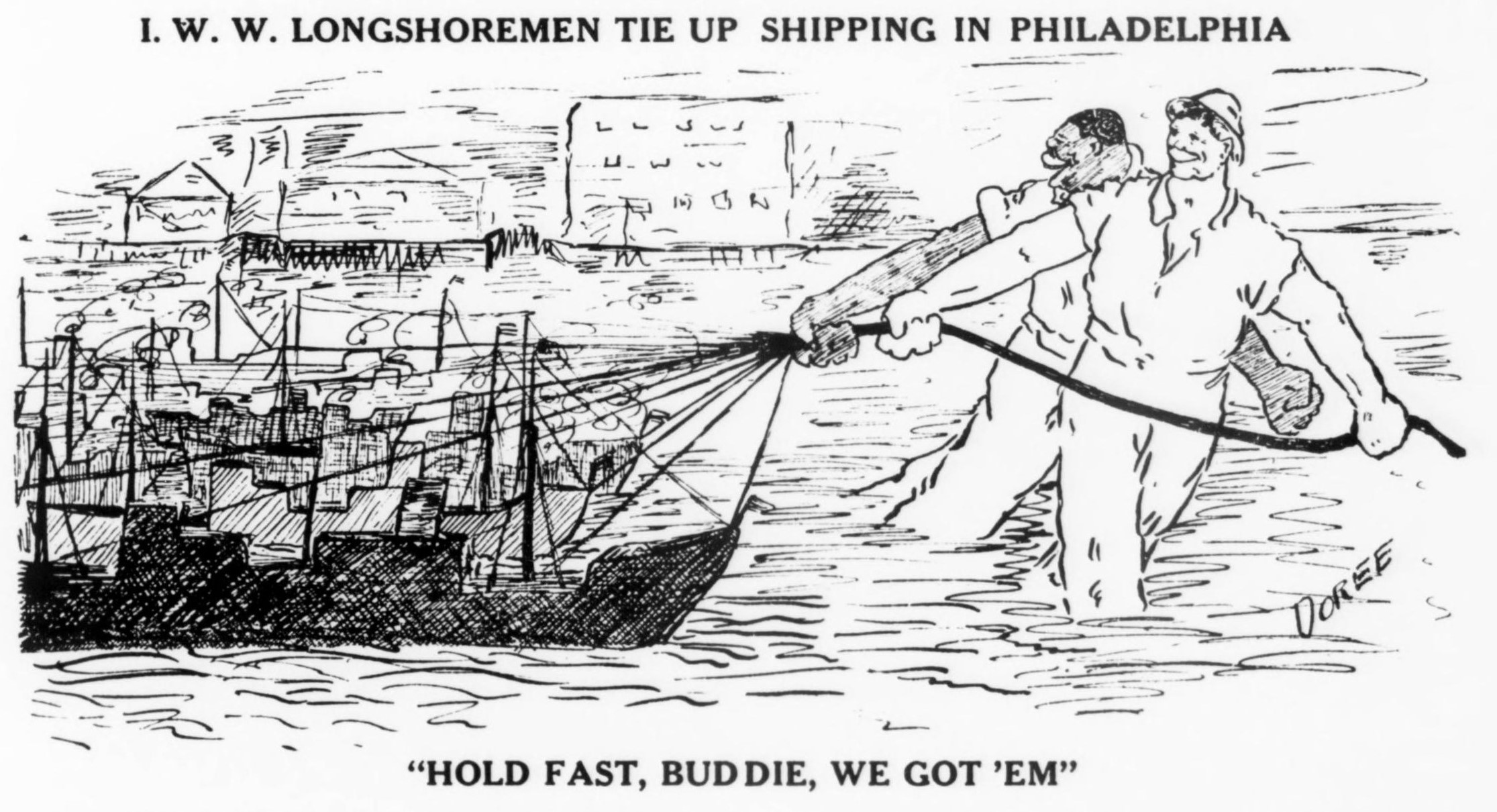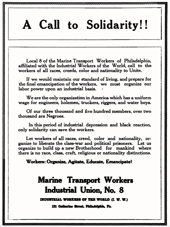 “Order! Order! I will now put the motion,” thundered Chairman White to the assembled I.W.W. longshoremen of the port of Philadelphia. There is silence. The air is tense with excitement and expectation. The next words of our colored chairman fell like hammer blows. “The motion is, ‘Shall we go on strike immediately’. We shall take a rising vote. All those in favor will stand up.” The silence of a moment before is broken by deafening cheers as the entire body rose to its feet. Cheers followed cheers. Hats went into the air. Pandemonium reigned supreme for several moments. Doubts and uncertainties of a moment before were swept away. All are happy. All are enthusiastic.