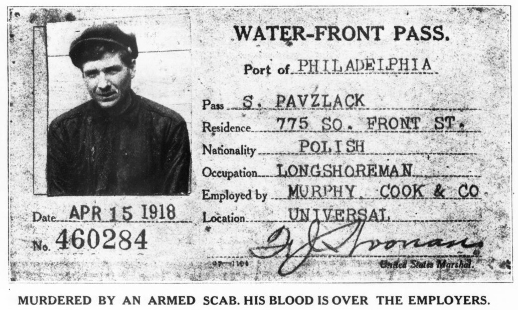 Fellow Worker Pavzlack was buried on Saturday, June 12. Hundreds of his fellow workers were present at the funeral services, where they paid their last solemn respects to the fallen battler in the class war. Fellow Worker Pavzlack is the second member of the I.W.W. murdered on the water front of Philadelphia. Three years ago Fellow Worker Martin Petkus was shot to death at Front and Reed streets while picketing in the sugar strike.