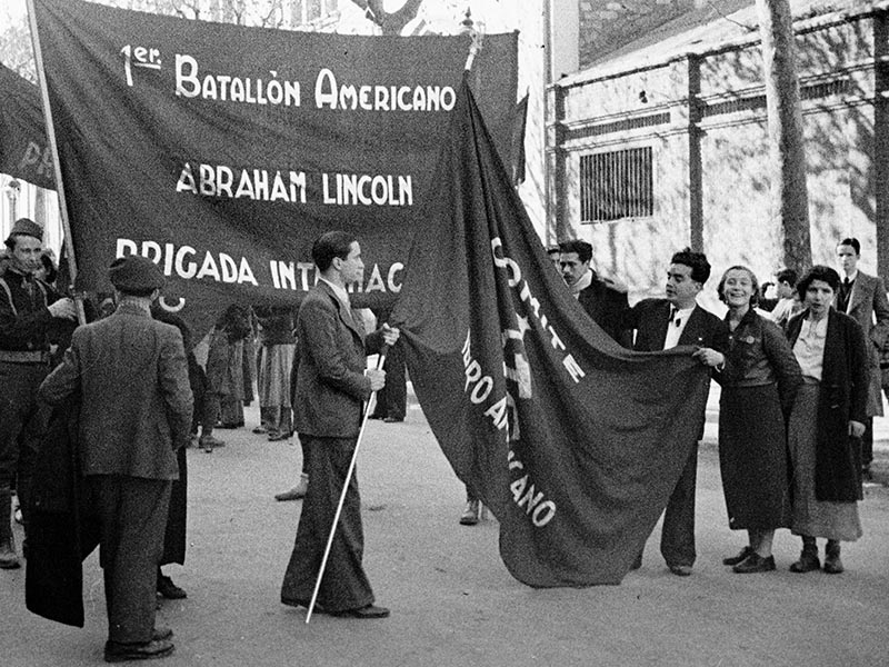 At our base we learned that we would act as the reserve for the American battalion already in action. We drilled in a bull-ring, and it was here that we saw our first Spanish bull-fight, American style. The automobile worker from Detroit painted a swastika on a white handkerchief, and the actor from Boston panted and snorted and charged. The actor tore the hated insignia to shreds, and the matador, together with the rest of us, gave three cheers.