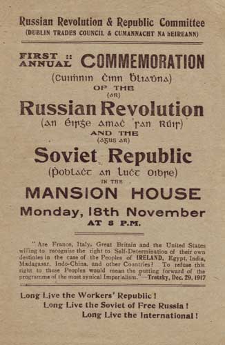 For the people in Ireland that is a great step forward. It spells the awakening of the people to the fact that political freedom is not the be-all of freedom; that to be truly free economic freedom must be linked with their political freedom. The inevitable has come. With the awakening of revolutionary spirit (caused by the insurrection of 1916) has come an intensive growth of revolutionary thought. The people of Ireland have always felt a quick sympathy with any movement by a people towards freedom, and have always rejoiced at the overthrow of a tyrant or oppressor. Since the overthrow of the Czar the Irish people have watched, as far as they were able, the acts of the liberated Russians, and the system they have set up in the place of the old tyranny. And they have found it good. It appeals to them, it is easy for them to understand, easy for them to approve. They have placed it side by side with the systems that prevail in the free republics of France and America, and have decided that the Russian system is the system that appeals to them, and which appears the most Just. And we in Ireland have long been hungry for justice; our hunger has whetted our desire.