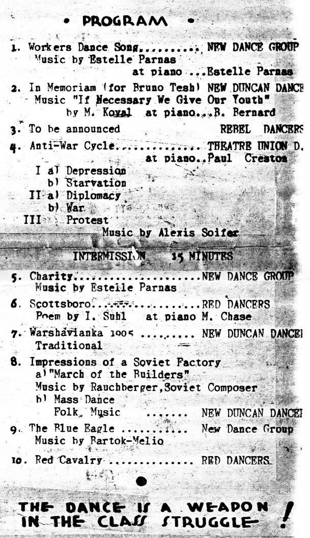The revolutionary dance can emerge only after the significant (revolutionary) emotion and the mode of expression have moved together for so long a time and have interpenetrated the composition to such an extent that the very movement of the dancers has revolutionary implications and the very idea arises not from casual inspiration, but from a living with and a thinking for the proletariat. It must be so subtle a welding together of manner and matter, of emotional content and dynamic ideational form, that it can, at its best and greatest agitational heights, commandeer revolutionary mass feelings of the profoundest and most stirring sort, and project proletarian ideas of vast implications on the one hand, or specific everyday class issues on the other. And it is beginning to do so. More and more is it becoming part of the daily cultural education of the working-class, more and more is it entering the theatre as vaudeville ally of the drama (vide: Newsboy, prize-winner at Theatre Competition), more and more is it assuming through performance on the concert stage an independence and vitality never before enjoyed by this type of art in the bourgeois world.