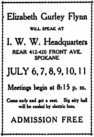 This full address given by Elizabeth Gurley Fynn to a wobbly audience during the Free Speech fights in Spokane on June 29, 1909 is an example of Flynn’s speeches and gives full evidence as to why her talks were so popular and moving.