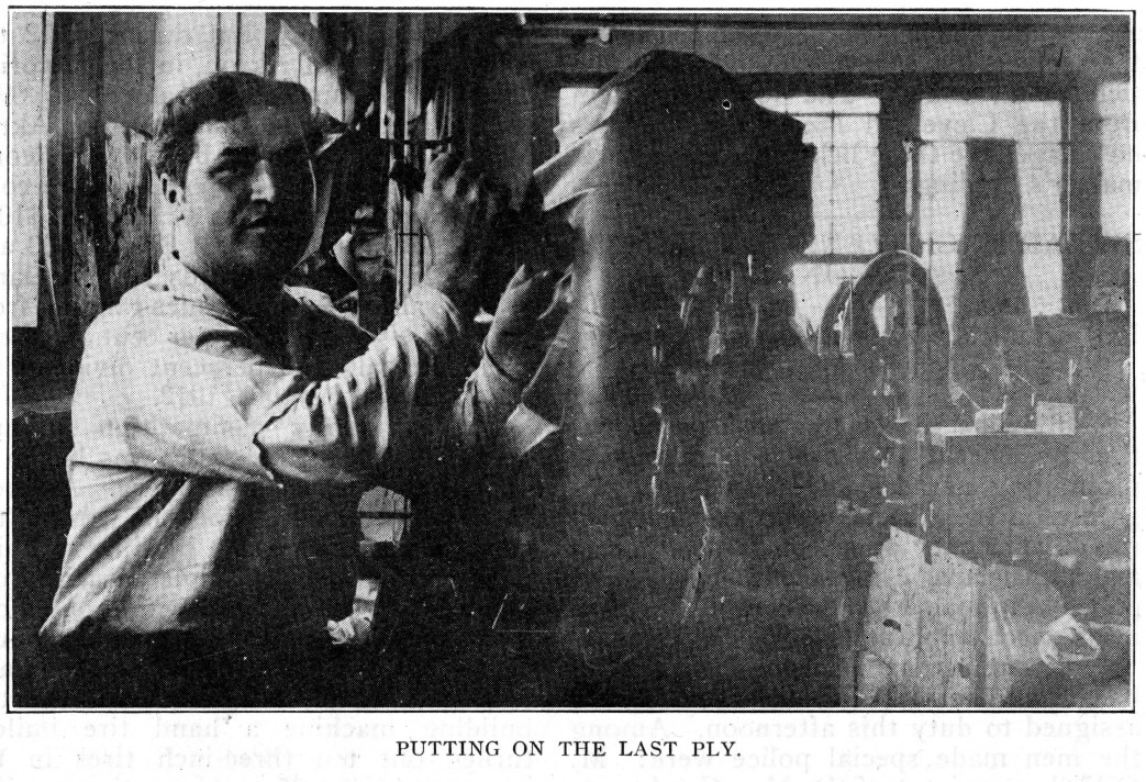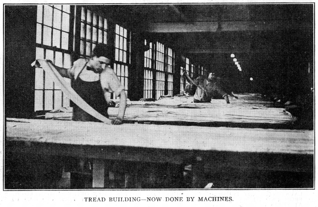 One of these photographs shows the builder putting on the third ply with edges trimmed. The last ply is carefully worked over the beads and “sewed in” ready for the gumming pits. After the final cut the tire is sent to a calendar room to receive a coat of composition.