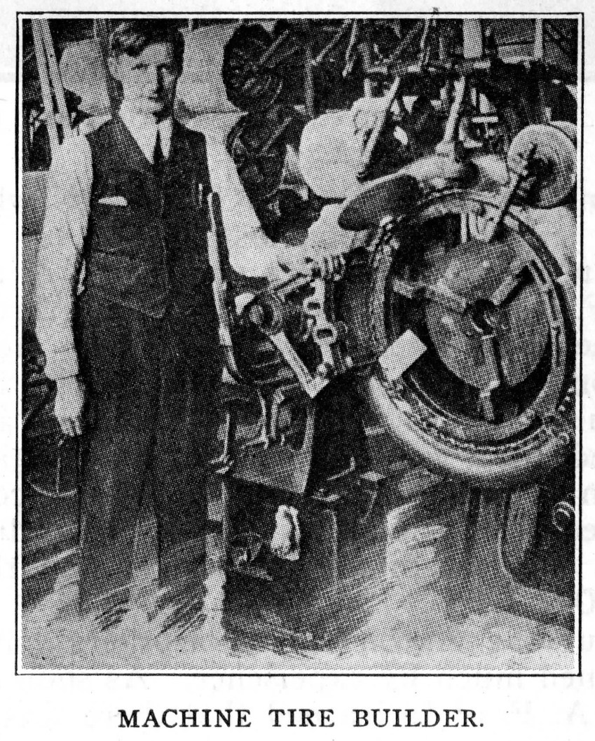 But gradually competition became keener and the Rubber Barons began to install labor-saving machinery. A stock-cutting machine now does the work of ten men. Four years ago a beading machine was invented which completely wiped-out hundreds of hand bead workers. Four men operating a machine could produce as much as a whole corps of trained hand workers. Before the advent of the tire building machine a hand tire builder turned out ten three-inch tires in ten hours, receiving 35 cents per tire on piece work. Now the tire building machine produces 112 three-inch tires all trimmed and ready for the finishers in ten hours. In the Diamond factory alone the force of tire builders was cut down from 510 to 112. The coming of these machines has cut the force 75 per cent.