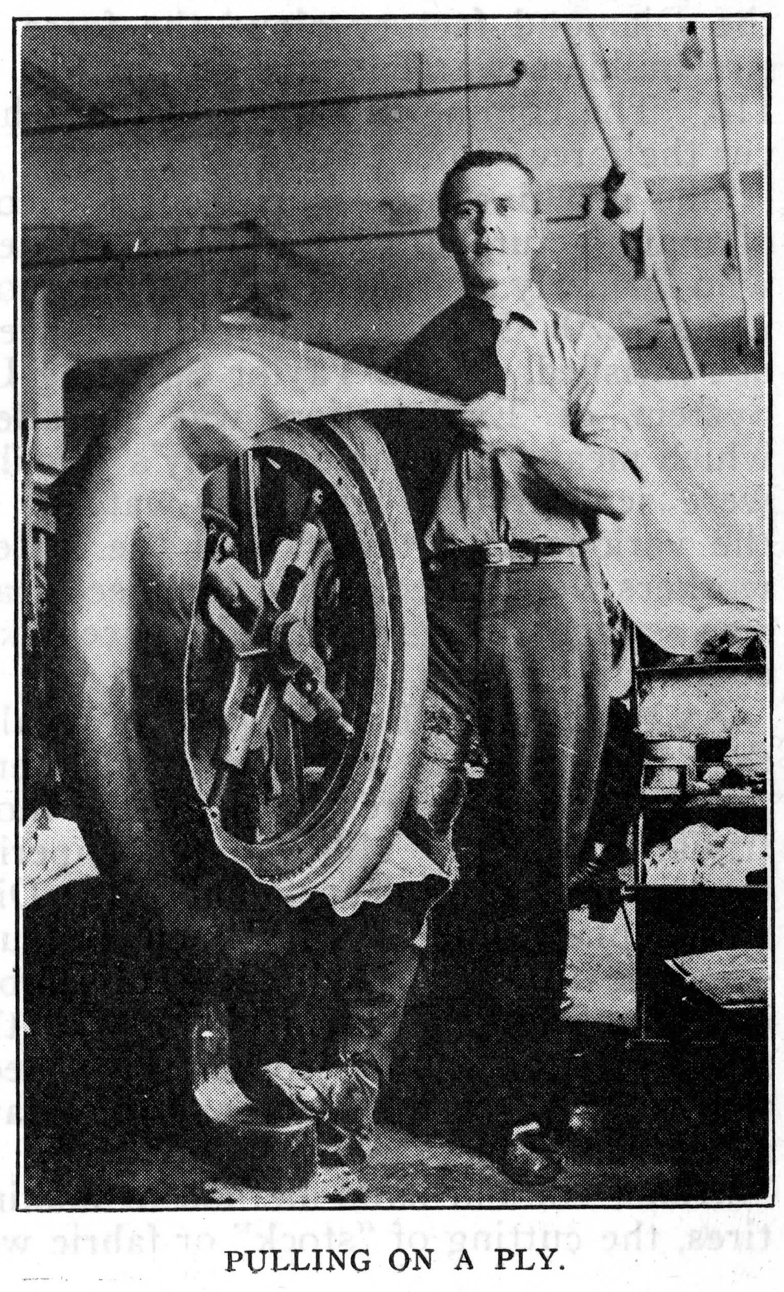 One of these photographs shows the builder putting on the third ply with edges trimmed. The last ply is carefully worked over the beads and “sewed in” ready for the gumming pits. After the final cut the tire is sent to a calendar room to receive a coat of composition.