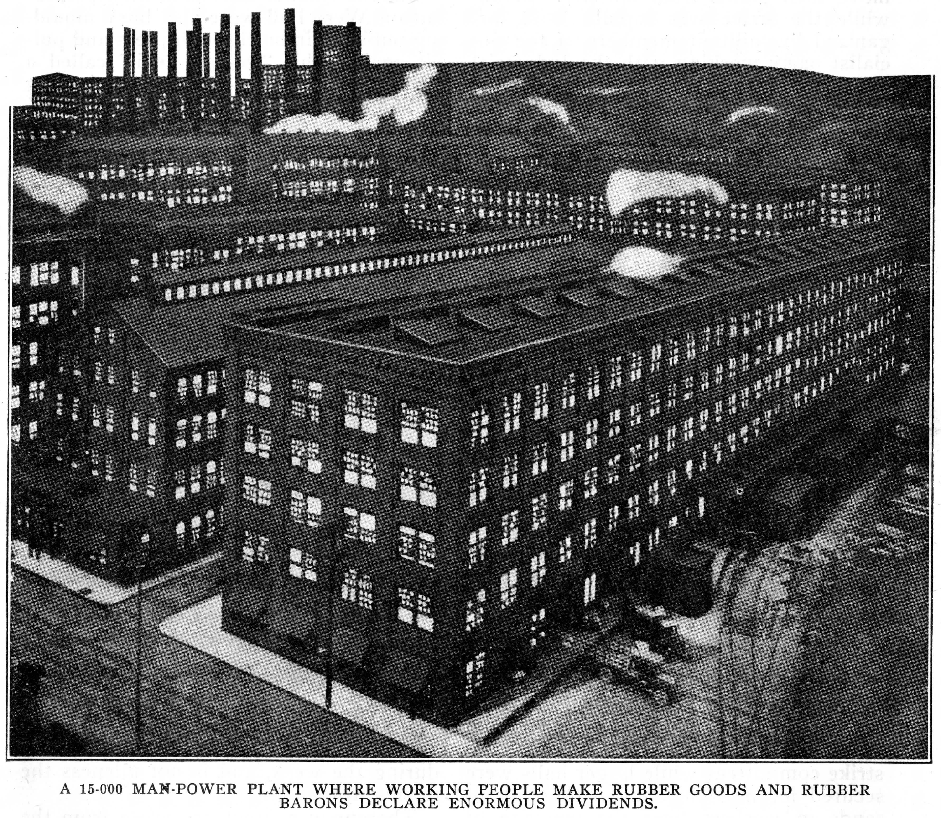 As the Rubber Barons grew in wealth they became more arrogant to their employees. Fines were levied for the most trivial mistakes. Mike Flynn, superintendent of the tire department of the Diamond plant “fired” fifty men because someone threw a small piece of rubber out of a window. Such is the way the free American rubber workers have been treated in Akron for years, and they have at last revolted.