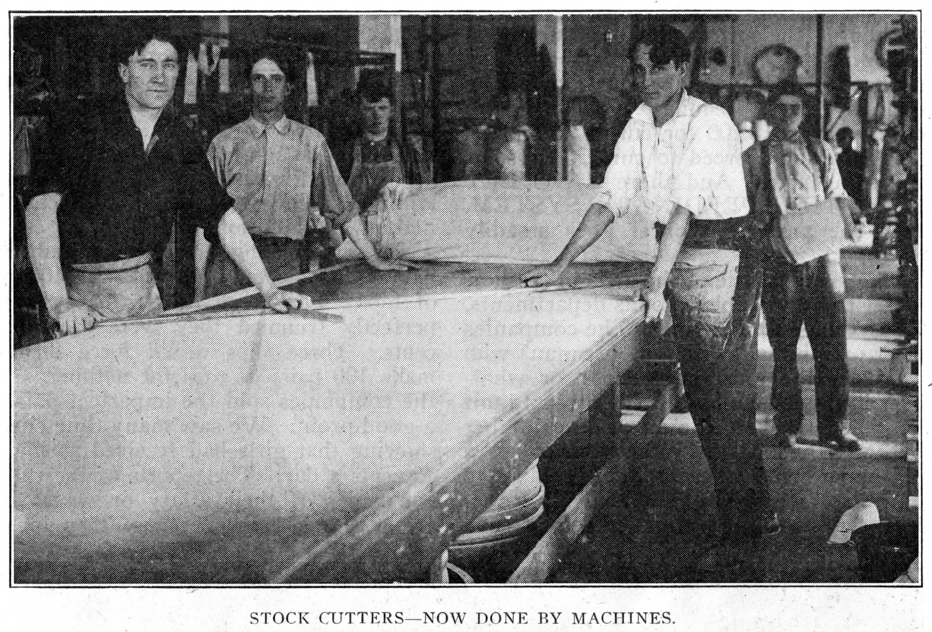 Under the old hand-method of making tires, the cutting of “stock” or fabric was all done by hand. The tread-builders also worked by hand, rolling and pressing the duck fabric for the tire builders. In the builders’ room, an iron core, weighing from 100 to 500 lbs., the exact size of the cavity, was covered with glue, or cement, and a light fabric pulled over it. The core then went to the tire builders.