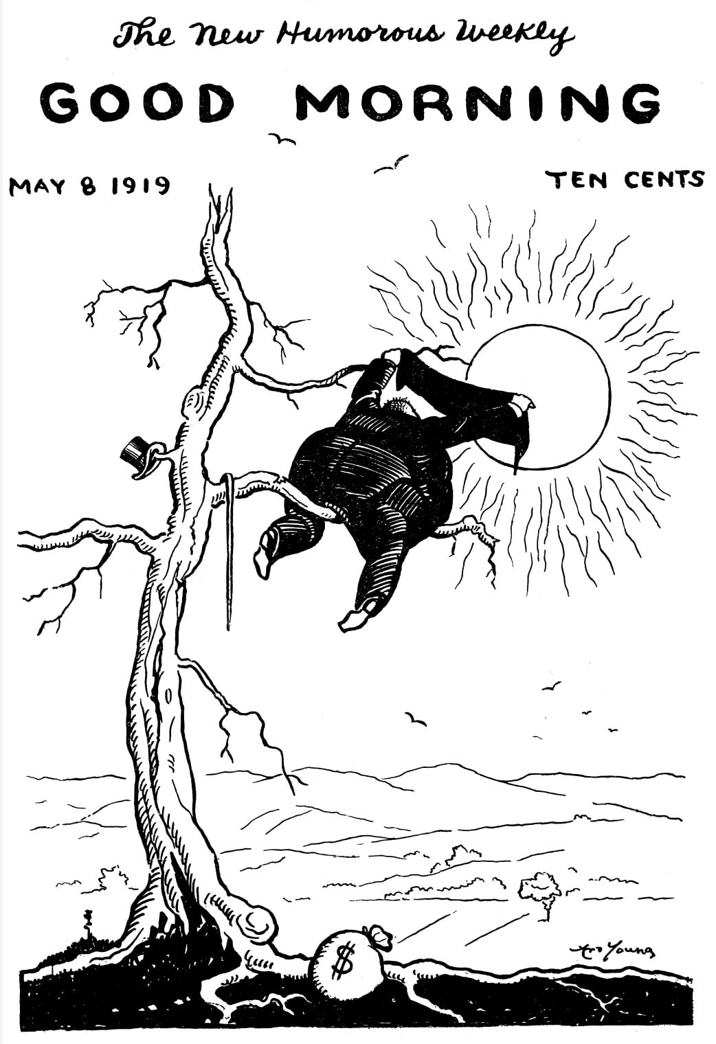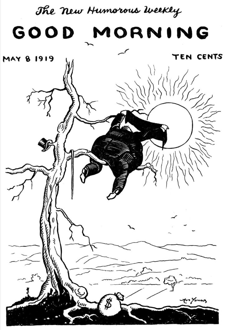 Good Morning was a (wonderful) left-wing illustrated humor magazine published bi-weekly from May 1919 until October 1921 by Ellis O. Jones and legendary radical cartoonist Art Young. Both had worked together earlier on The Masses. Good Morning was funded by donations and was forced to decrease in frequency from weekly to semi-monthly to monthly with a press run between 4 and 10 thousand, finally folding in late 1921.