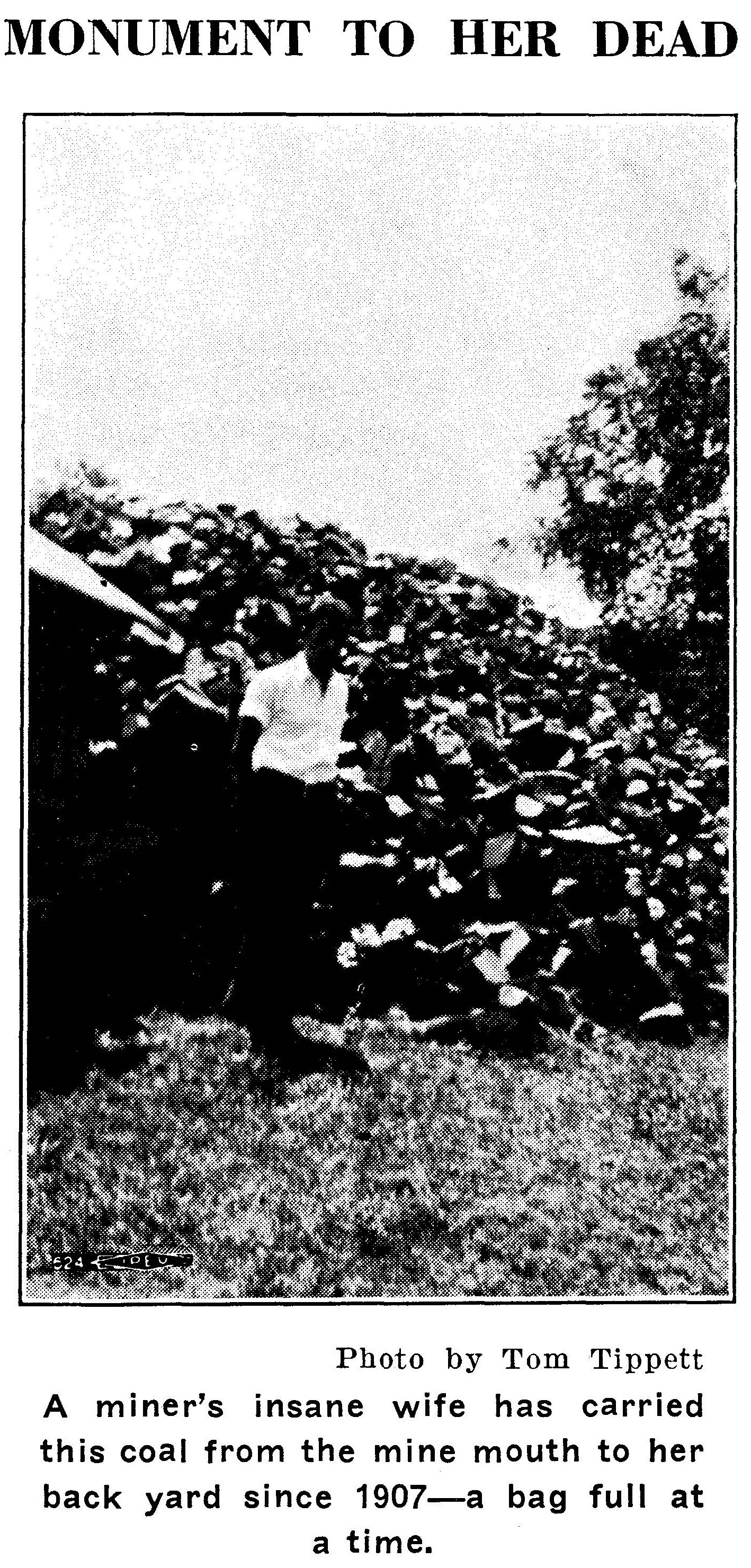 But Mrs. Daves could not forget. She kept looking for her husband. When the mine began operating again she watched every car go over the tipple. Her eyes followed the coal through the shaker into the railroad cars. The coal company, as well as the priest, kindly enough tried to divert her. “She, like everybody else, must forget.” Then she began carrying the coal home to her own yard where she could look for her man unmolested. From that time on, every day, rain or shine, winter or summer, she has gone to the old number eight mine, picked up a sack of coal, slung it on her shoulder and climbed up the hill to her yard. And for twenty-three years she has been hunting there for the body of the man who had walked out of her house to his work and never came back. The coal pile has grown by her labors, up and up, until it stands now ready to bury her, house, and all —a bleak and terrible monument to the suffering of all coal miners’ women wherever coal is mined.