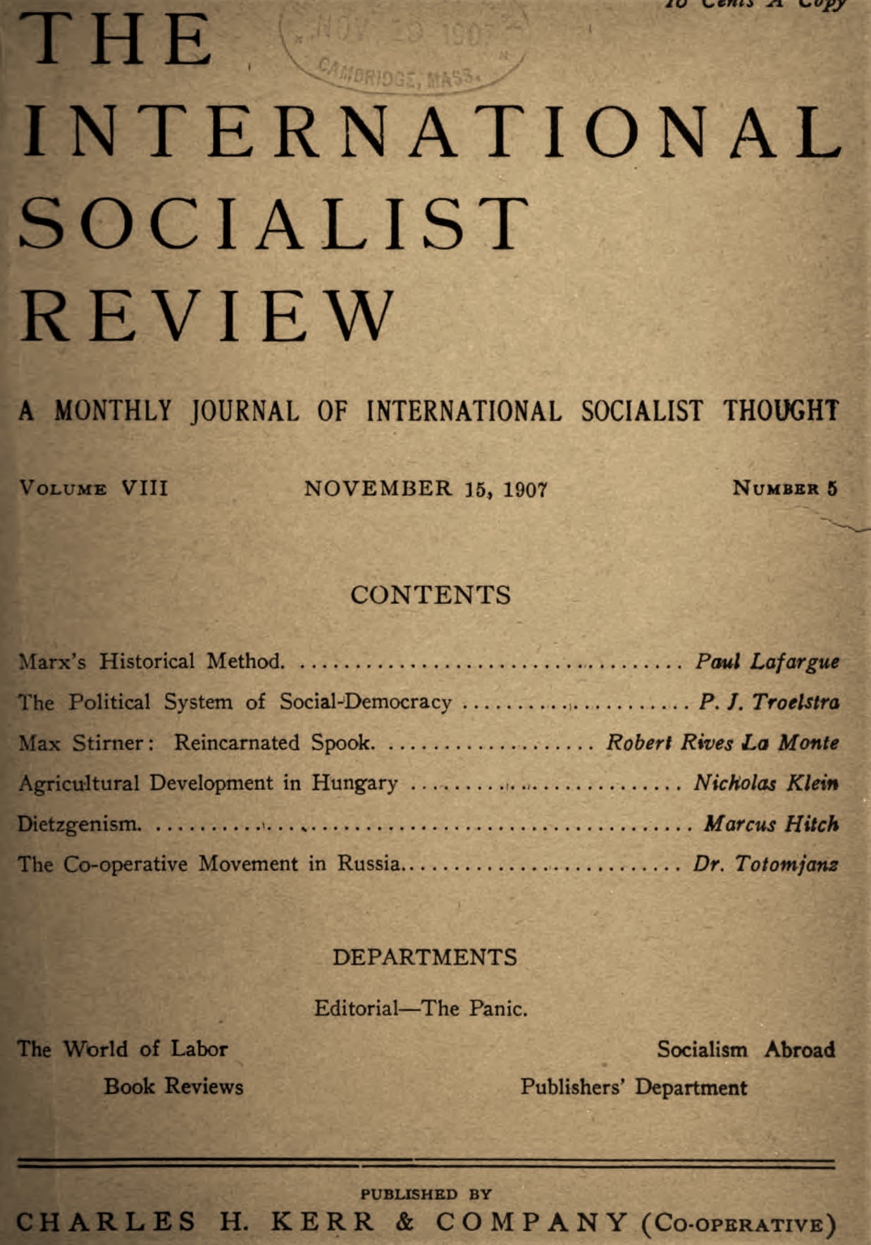 Contents: Marx’s Historical Method by Paul Lafargue. The Political System of Social-Democracy by P.J. Troelstra, Max Stirner: Reincarnated Spook by Robert Rives La Monte, Agricultural Development in Hungary by Nicholas Klein, Dietzgenism by Marcus Hitch, Co-operative Movement in Russia Dr. Totomjanz, DEPARTMENTS: Editorial by A.M. Simons – The Panic, World of Labor by Max Hayes, Book Reviews, Socialism Abroad, Publishers’ Department.