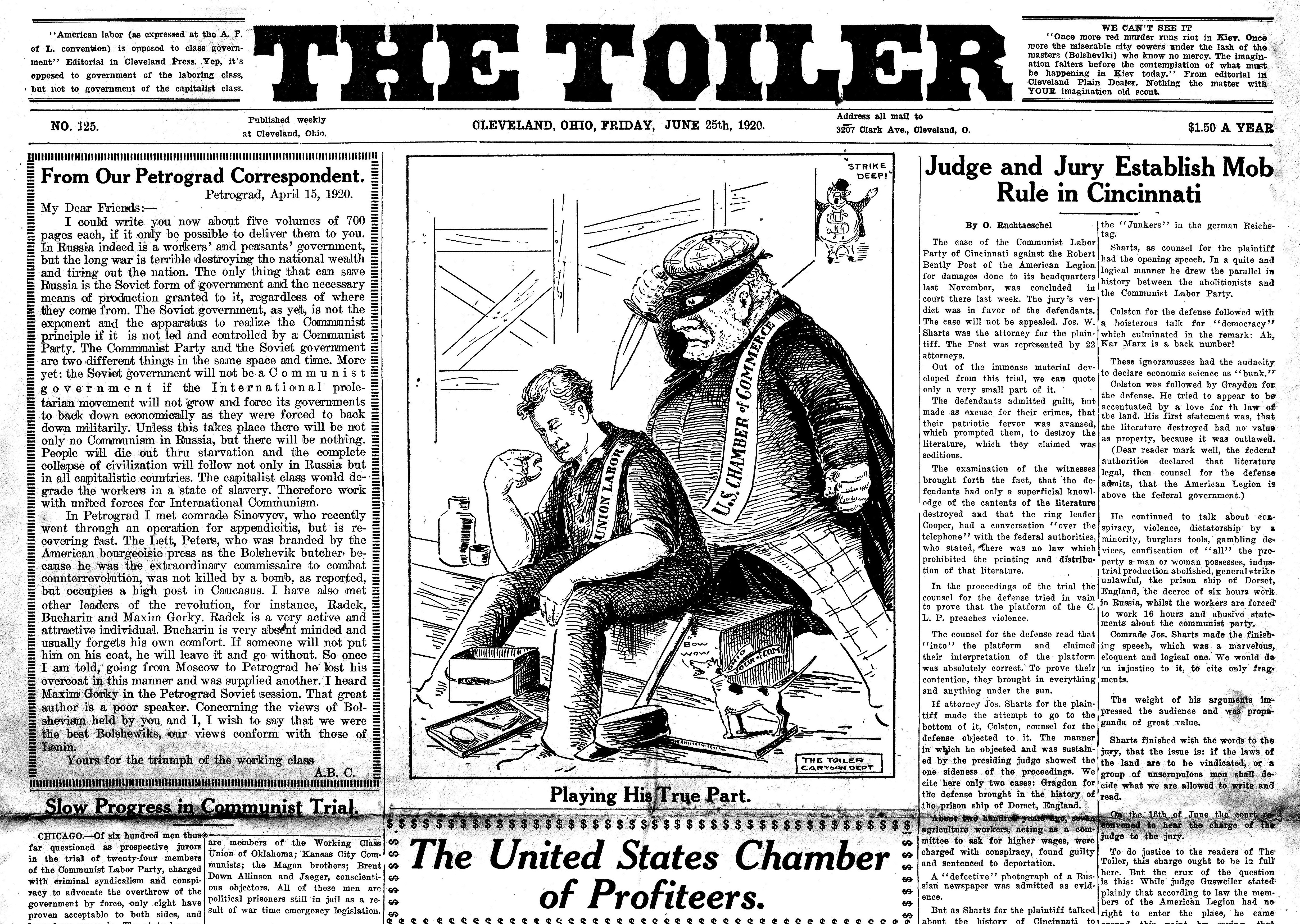 The Toiler was a significant regional, later national, newspaper of the early Communist movement published weekly between 1919 and 1921. It grew out of the Socialist Party’s ‘The Ohio Socialist’, leading paper of the Party’s left wing and northern Ohio’s militant IWW base and became the national voice of the forces that would become The Communist Labor Party. The Toiler was first published in Cleveland, Ohio, its volume number continuing on from The Ohio Socialist, in the fall of 1919 as the paper of the Communist Labor Party of Ohio. The Toiler moved to New York City in early 1920 and with its union focus served as the labor paper of the CLP and the legal Workers Party of America. Editors included Elmer Allison and James P Cannon. The original English language and/or US publication of key texts of the international revolutionary movement are prominent features of the Toiler. In January 1922, The Toiler merged with The Workers Council to form The Worker, becoming the Communist Party’s main paper continuing as The Daily Worker in January, 1924.