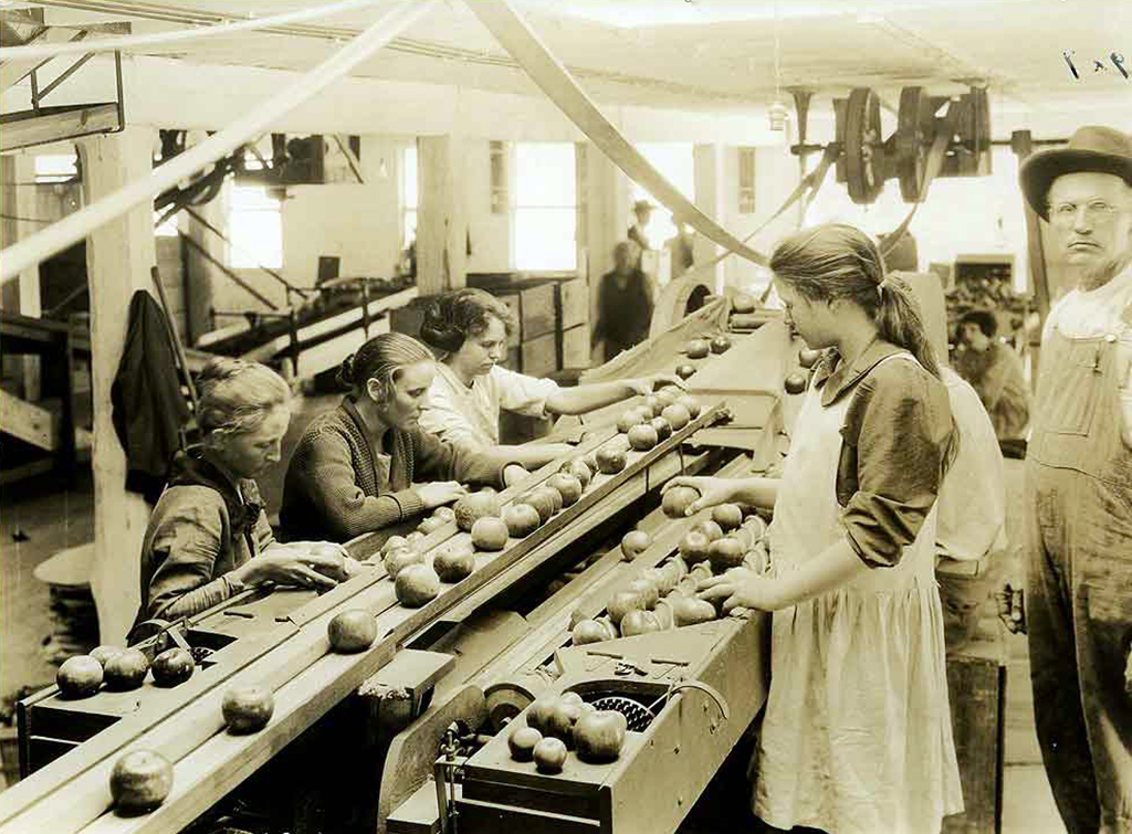 The sorting is all speed-up work. Machine sorting is especially hard. Ten hours of feeding apples into a machine that never stops except an hour at noon! The bench sorters are always given more than they can do. Then they not only have the foreman driving them but the piece work packers are always crying for more apples since they can pack more boxes if the bins are kept full all the time.