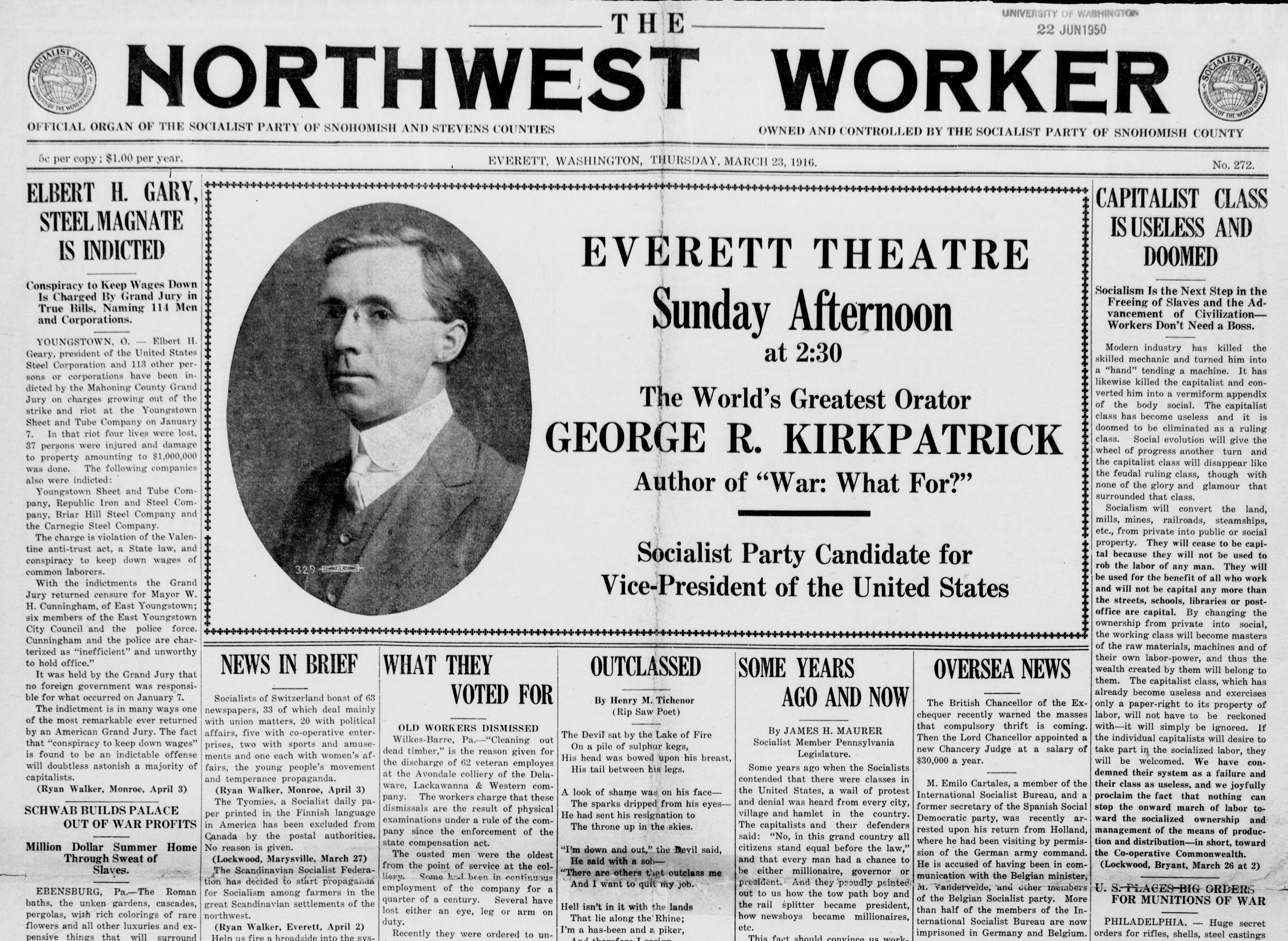The Washington Socialist was a weekly newspaper of the Socialist Party of Snohomish County published in Everett, Washington and edited by Maynard Shipley. Closely aligned with the Industrial Workers of the World, who were strong in the Pacific Northwest’s lumber industry, the paper ran for only 18 months when it was renamed The Northwest Worker with Henry Watts as editor in June, 1915, and again Co-Operative News with Perter Husby as editor in October, 1917. Like virtually all of the left press, the Co-Operative News was suppressed in June 1918 under the Federal Espionage Act.